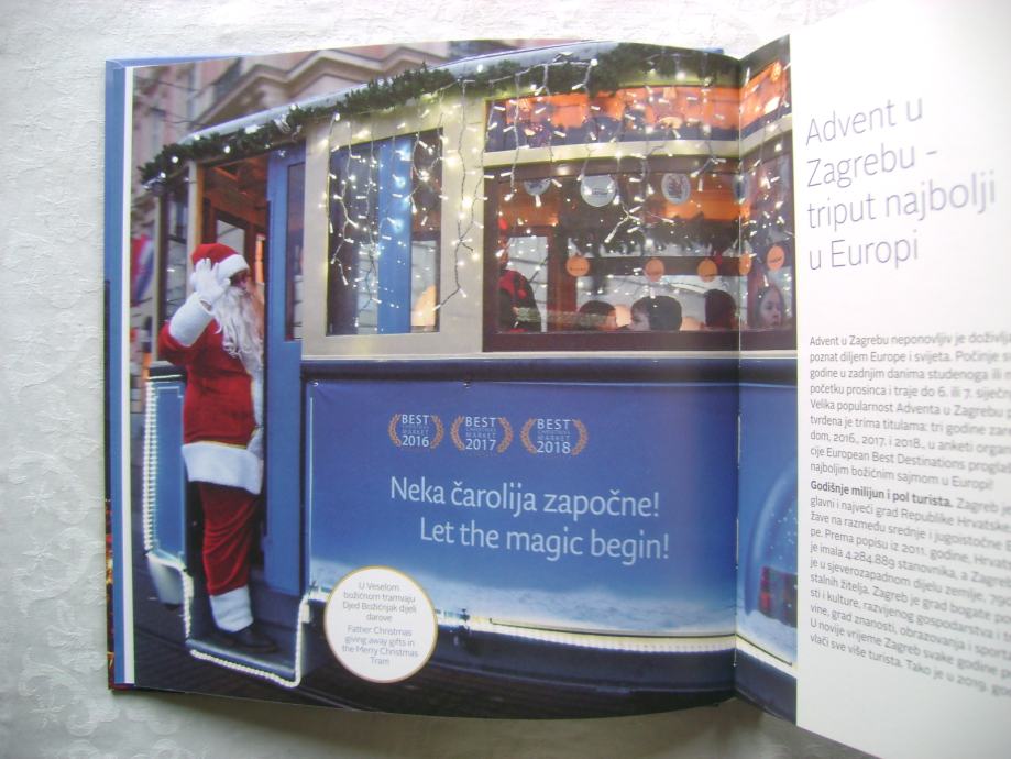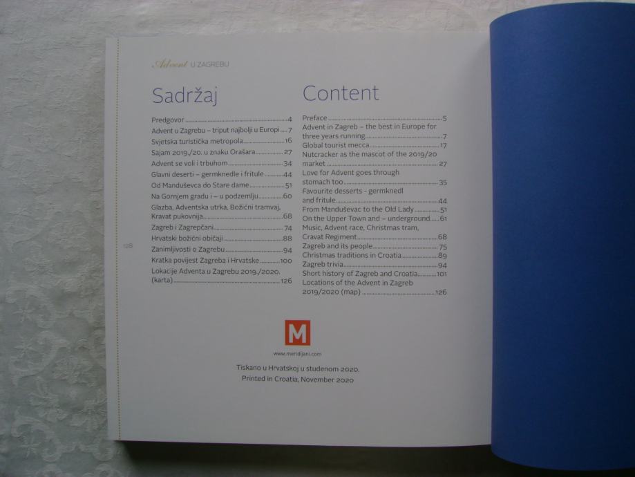 "Knjiga “Advent u Zagrebu/Advent in Zagreb” ukratko tumači što je advent ili došašće te potom obrađuje glavne dijelove Adventa u Zagrebu: njegove lokacije, gastronomsku ponudu, suvenire, kulturna i druga događanja, a govori i o Zagrebu i njegovim ljudima. U dodacima knjiga opisuje neke stare hrvatske božićne običaje, iznosi neke zanimljivosti o Zagrebu i daje, u obliku kronologije, kratak pregled povijesti Zagreba, ali i najvažnije događaje u povijesti Hrvatske. Sve je tako pisano da se što bolje objasni stranim turistima, poslovnim ljudima i drugima koji dolaze u Zagreb i Hrvatsku.