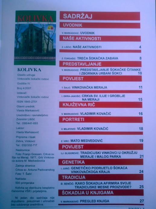 Prekrasna kolekcija za prave ljubitelje Slavonije, slavonske tradicije, znamenitosti, običaja,.... Sastoji se iz tri dijela, prvi je vezan za Vinkovce, opisuje uglavnom u slikama glavne gradske događaje, znamenitosti i druga obilježja grada, drugi dio je Kolivka, glasilo udruge Vinkovački šokački rodovi, koji se tiska u vrlo maloj nakladi i više o sadržaju se može vidjeti u prilogu, a treći dio je Sjaj na obzorju-Slavonija, gdje su u prekrasnim slikama i tekstovima opisane neke od najljepših povijesnih, prirodnih i kulturnih znamenitosti cijele Slavonije.
