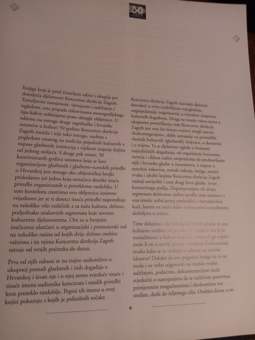 Koncertna direkcija zagreb, 50. obljetnica koncertne direkcije Zagreb. Broj str. 203,stanje očuvanosti:odlično. Urednica:Jagoda Martinčević. Knjiga je bogata fotografijama i zapisima svih 50 godina djelovanja.Godina izdanja 2002.kontakt broj:0919512689