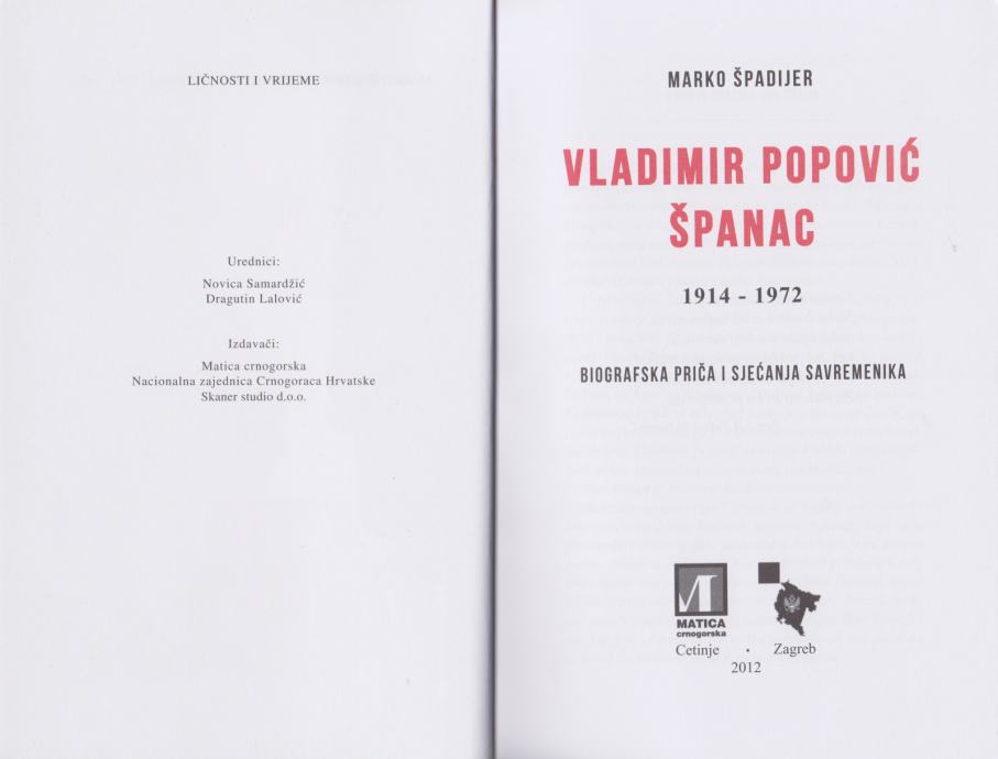Marko Špadijer: Vladimir Popović-Španac 1914.-1972., biografska priča i sjećanja savremenika, Matica crnogorska, Cetinje - Nacionalna zajednica Crnogoraca Hrvatske - Skaner studio d. o. o., Zagreb 2012.