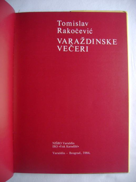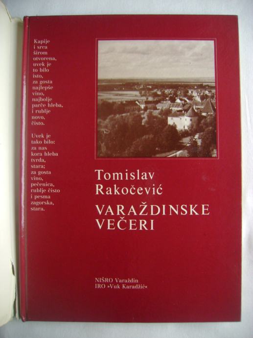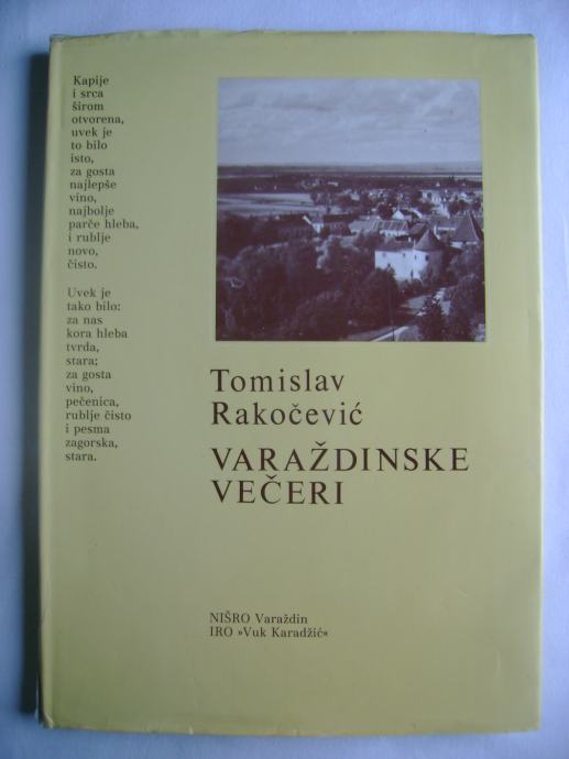 Monografija / zbirka poezije - Tomislav Rakočević - Varaždinske večeri - izdavači NIŠRO Varaždin i IRO Vuk Karadžić, Varaždin-Beograd 1984. godine, 22 x 31 cm, tvrdi uvez i papirnati omot, 103 stranice, bogato ilustrirano starim slikama Varaždina.