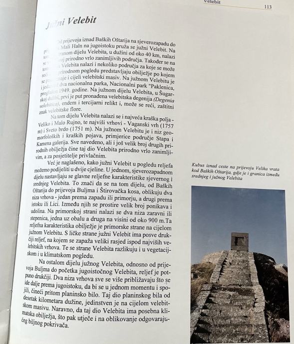 Ova fotomonografija nastala je na osnovi autorovog dužeg boravka na Velebitu. U odabiru fotografija dana je prednost područjima koja su lakše ili barem ne tako teško dostupna. Knjiga pruža osnovne spoznaje o karakteristikama Velebita, a fotografije barem dijelom pokušavaju dočarati svu ljepotu ovog veličanstvenog planinskog lanca.
