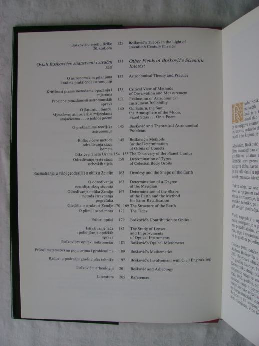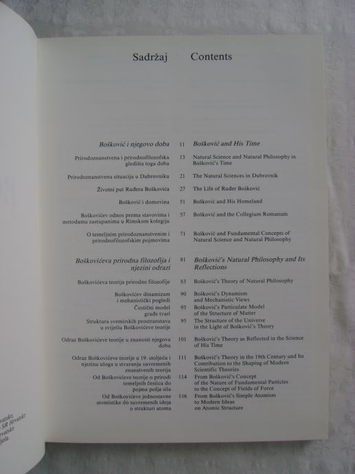 "U monografiji o djelu i životnom putu velikog znanstvenika sučeljena su Boškovićeva prirodoznanstvena stajališta sa znanošću njegova doba, analizirani odrazi njegove teorije prirodne filozofije u razvoju znanosti od 18. stoljeća do danas. Boškovićev stručni rad predočen je doprinosima teorijskoj i praktičnoj astronomiji, višoj geodeziji, optici, graditeljskoj tehnici i matematici. Knjiga je priređena kao dvojezično izdanje na hrvatskom i engleskom jeziku, u prijevodu prof. Janka Paravića."