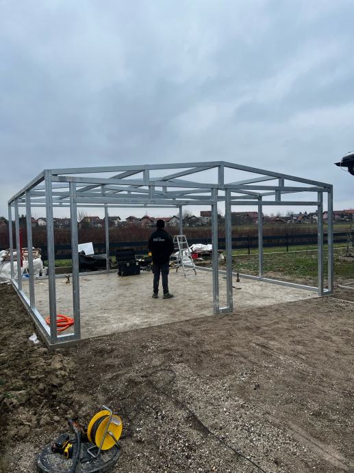 Izrađujemo montažne garaže po narudžbi, prilagođene vašim potrebama i prostoru. Ova garaža dimenzija 6.3x7m, visine 3.5m (pad krova na 3m), nudi čvrstu i dugotrajnu konstrukciju s vrhunskim materijalima, brzu montažu i potpunu zaštitu vaših vozila, opreme i alata.