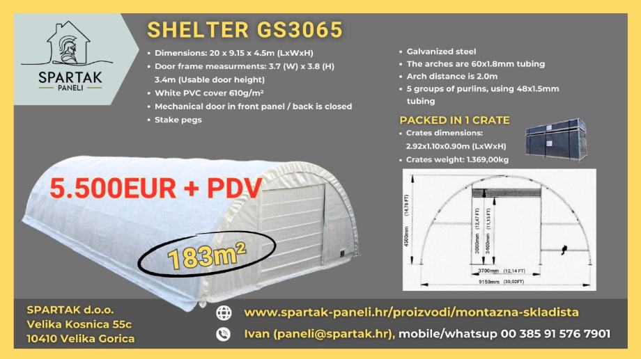 DUŽINA X ŠIRINA X VISINA U NAJVIŠEM DIJELU / BOČNA VISINA: 20 M x 9,15 M x 4,5 MM - 5.500,00 eur + PDV
