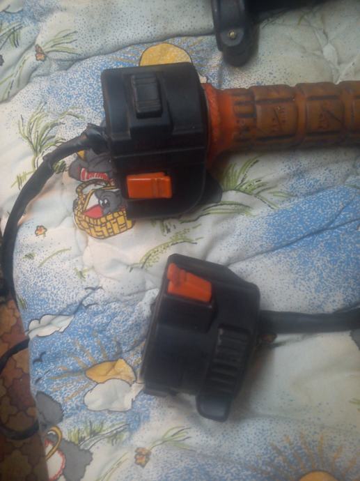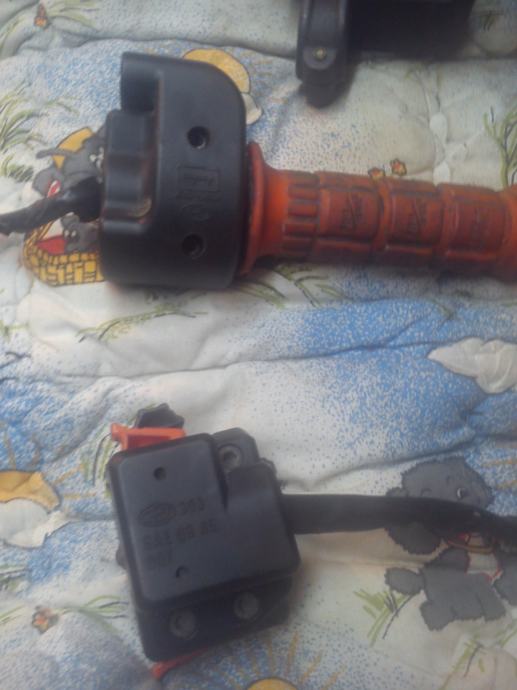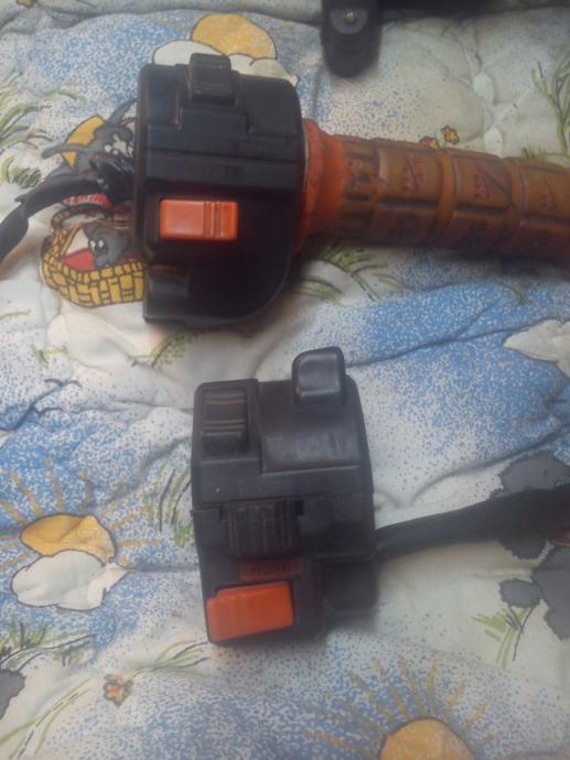 -domino komplet prekidača lijevi i desni, desni je zajedno s gas ručkom (brzi gas, rapid trotle), na lijevom su truba, žmigavci, pozicija, dugo, kratko svijetlo, blenda; na desnom kontakt -gašenje kill switch, tipka pokretanja mašine (anlasera preko relea anlasera), vrlo kvalitetna izrada u sklado s renomeom firme domino -