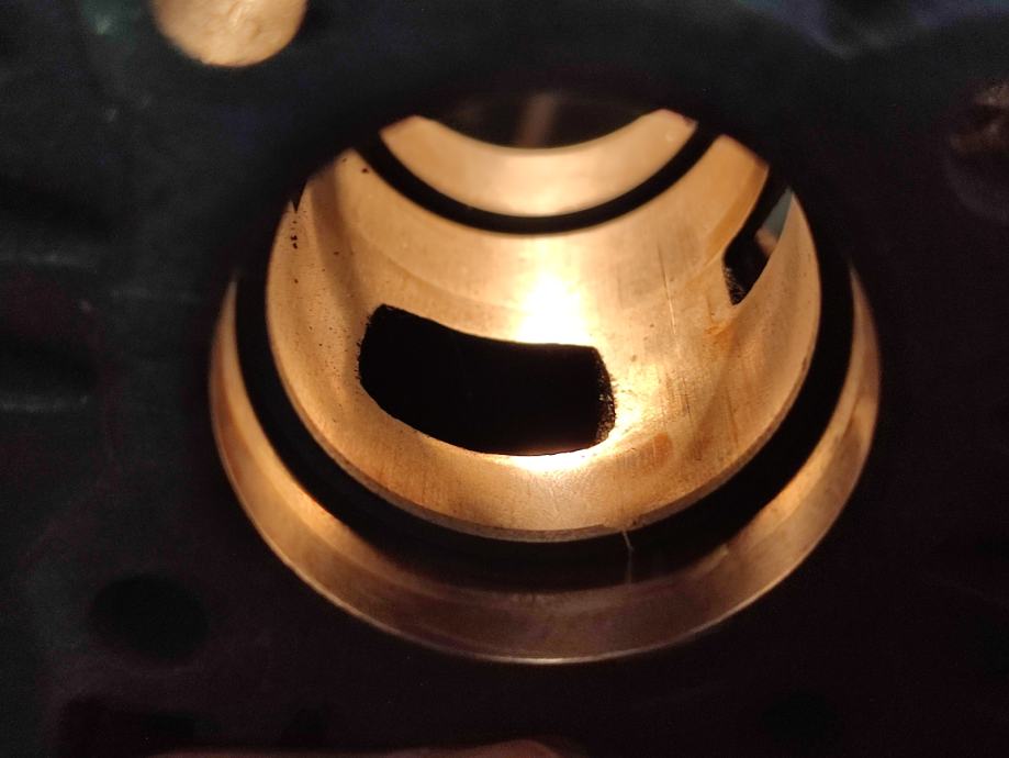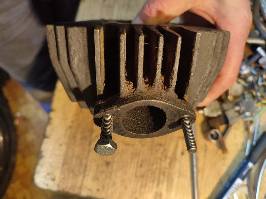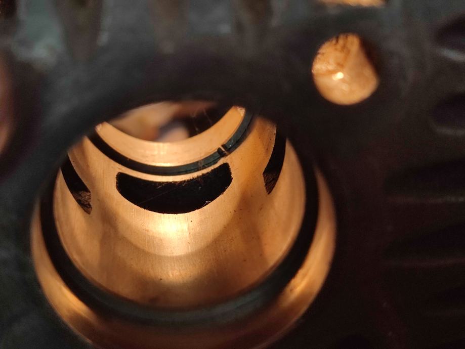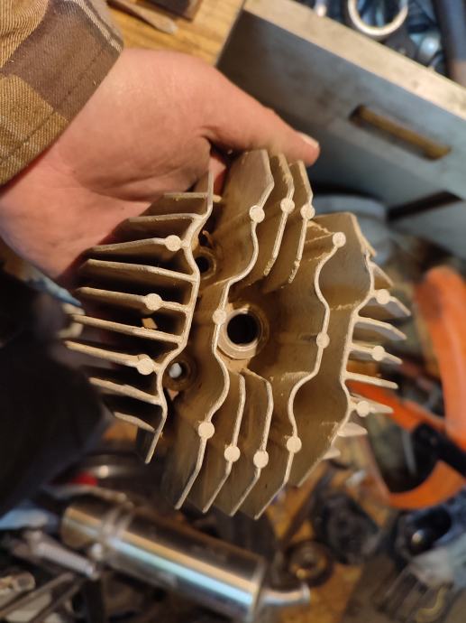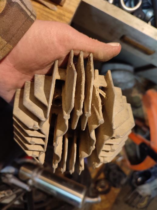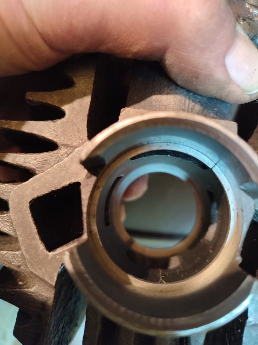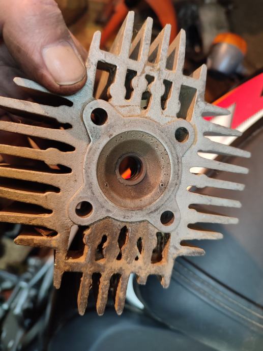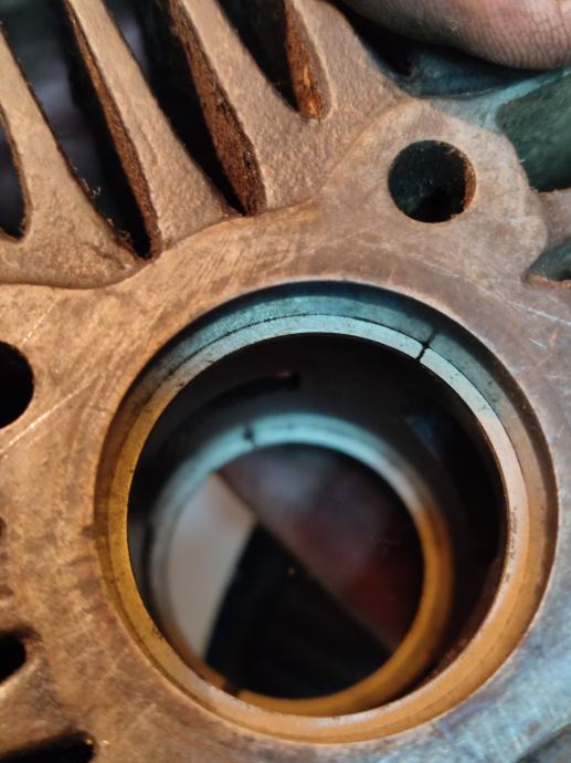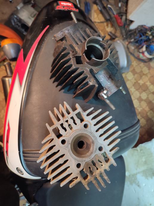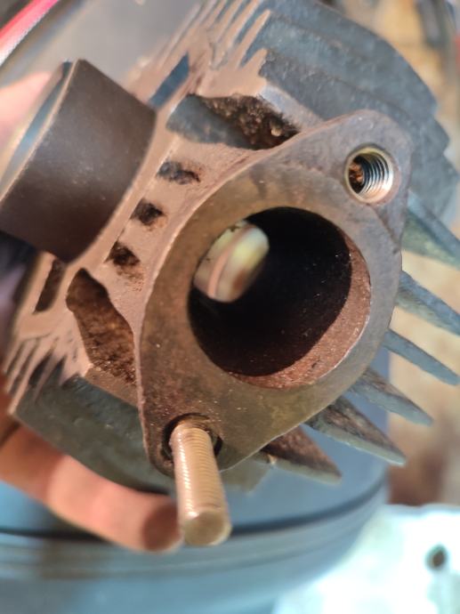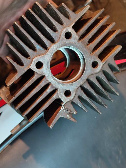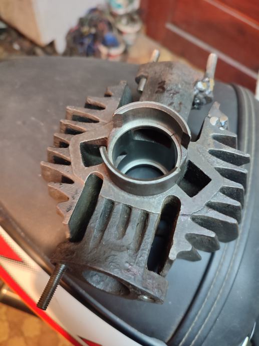 Cilindar 39.5 iznutra odličan 39.5 mjera, vidi se zazor karika unutra, navoj na ispuhu je jedan m 7 a drugi m 8, na usisu m 7, cilindar ima popravljano zavarivanjem, kanali nisu dirani 80 eura