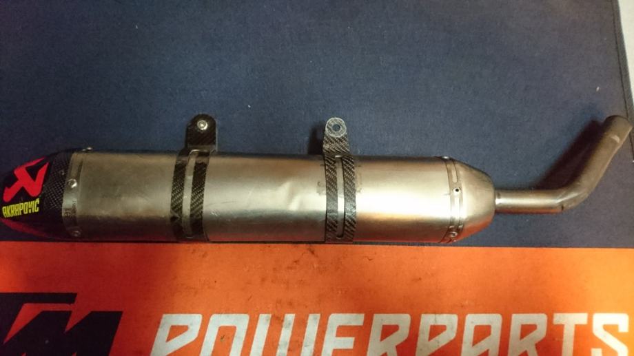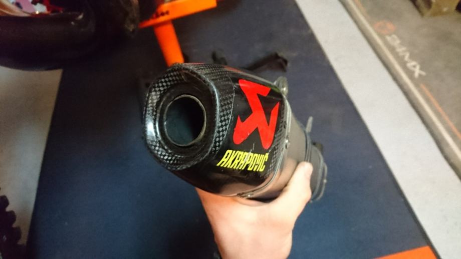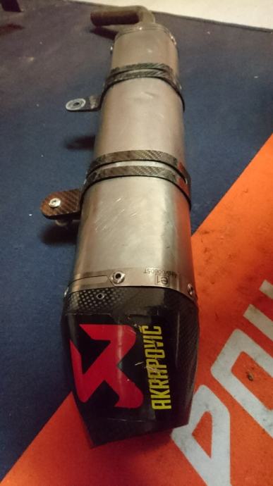 Akrapović iz ktm powerparts kataloga, auspuh nije ko novi al je čitavi, gore je nova karbonska kapa ojačana original iz akrapovića, karbonske obujmice(nosači) su popucale pa ih treba pokrpati ili napraviti/kupiti nove,uz auspuh dajem improvizirane metalne nosače