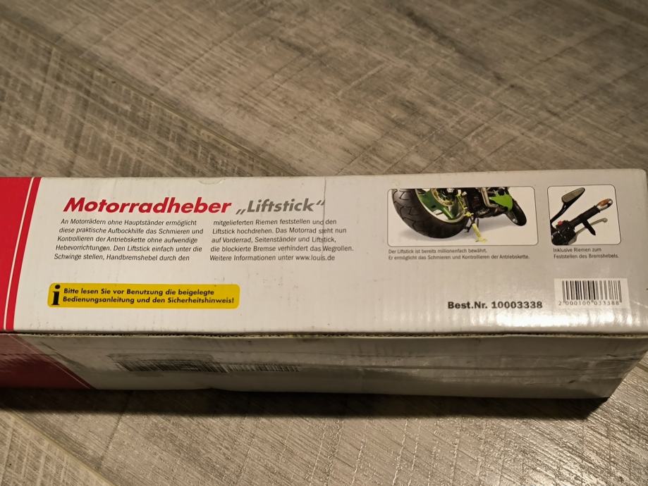 Simply place the Liftstick under the swing arm, secure the hand brake lever with the strap supplied and turn the centre-piece to raise. The motorbike will stand on the front wheel, sidestand and Liftstick, while the engaged brake prevents it from rolling away.