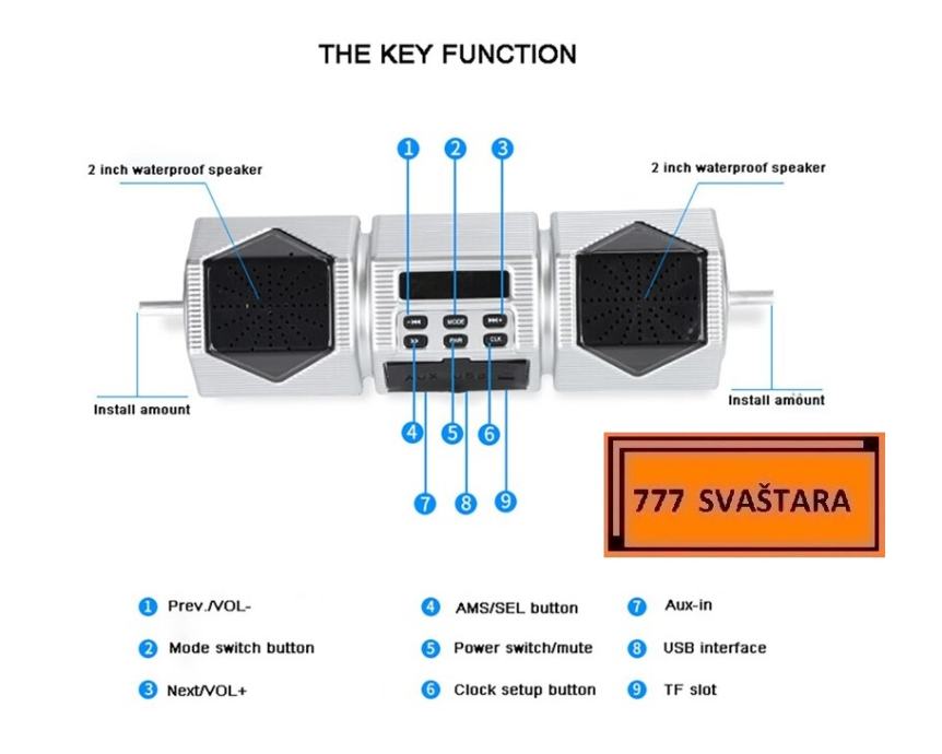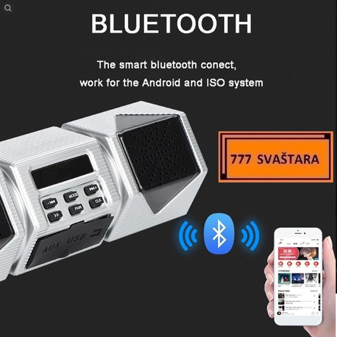 Glavna značajka:Bluetooth bežični,3,5mm audio priključak AUX IN,USB 2.0,podrška SD utor,FM radio,zaslon sa satom