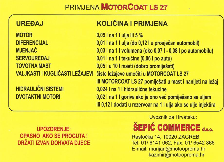 MOTORCOAT LS 27 - najučinkovitiji dodatak svim mazivima (mineralnim i sintetskim, dvotaktolima i mastima) potreban je na svim mjestima gdje dolazi do trenja metalnih dijelova