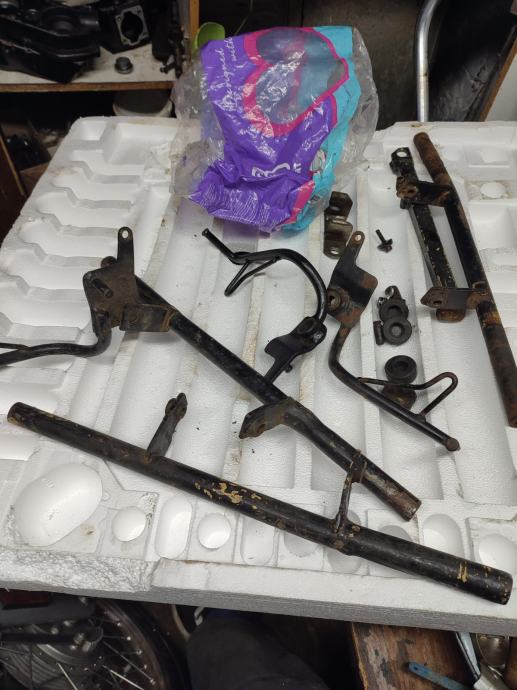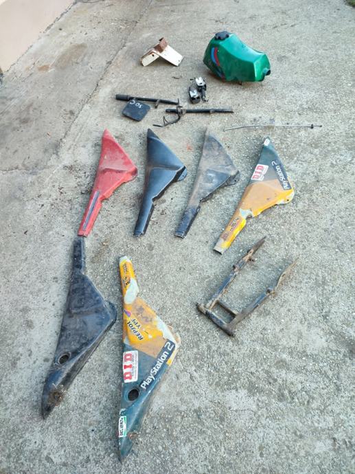 -kotači -imam komplete za prvi i zadnji kotač bez felgi, osovine, distance, nosač lančanika, poklopce pakni s paknama, prednju felgu potpuno ravnu (siva, ne farbana) kotači , imam vrlo dobar prednji kotač crna sredina, zadnji kotač imam slabije stanje