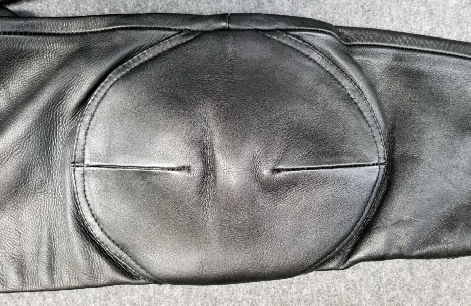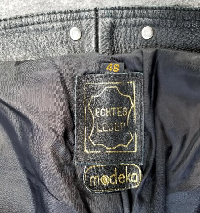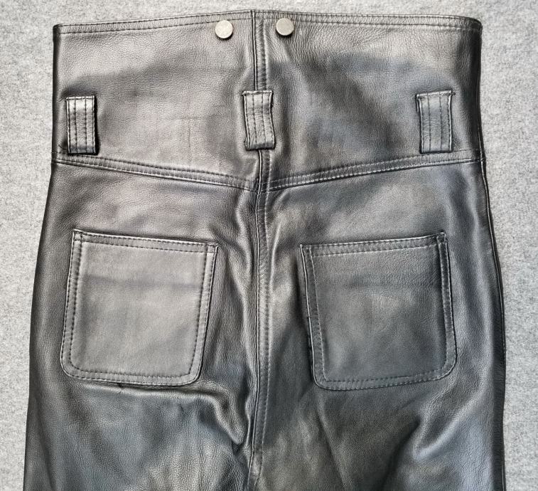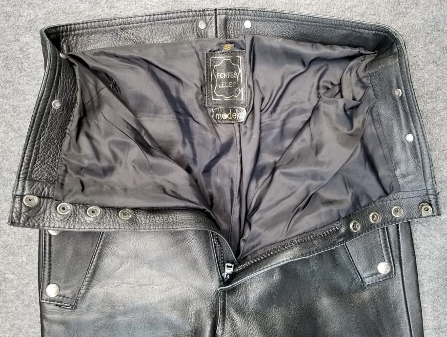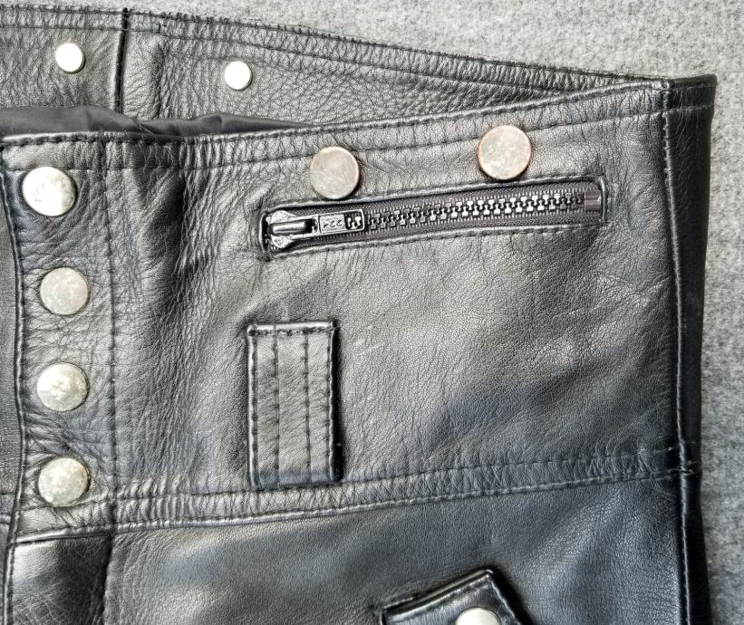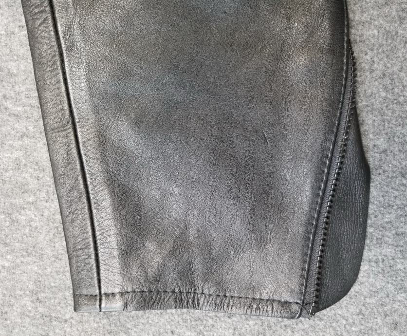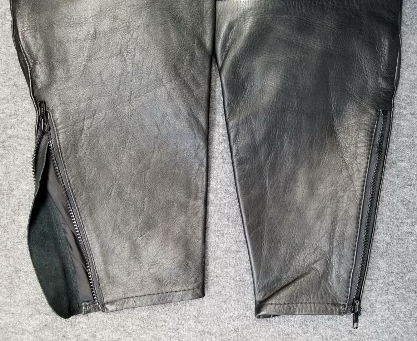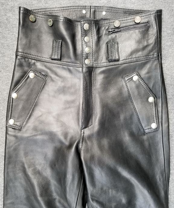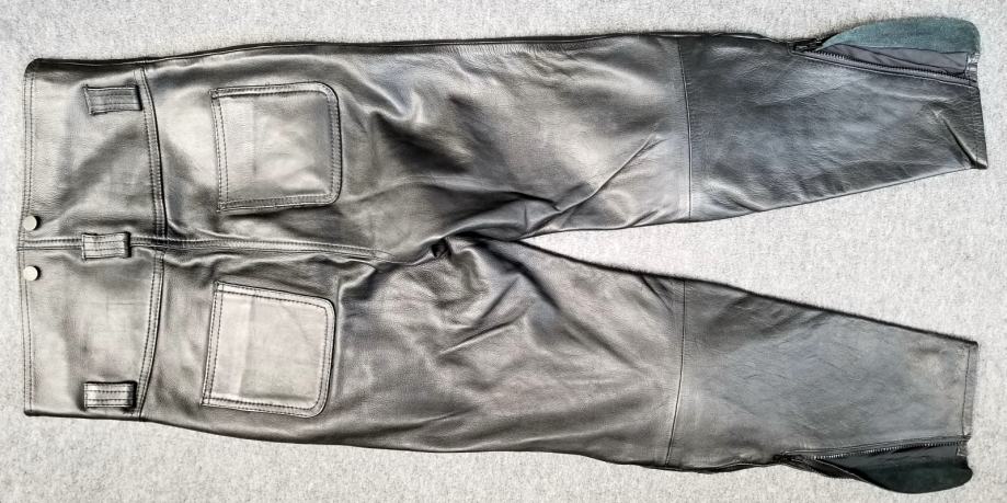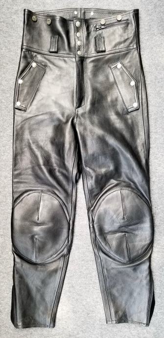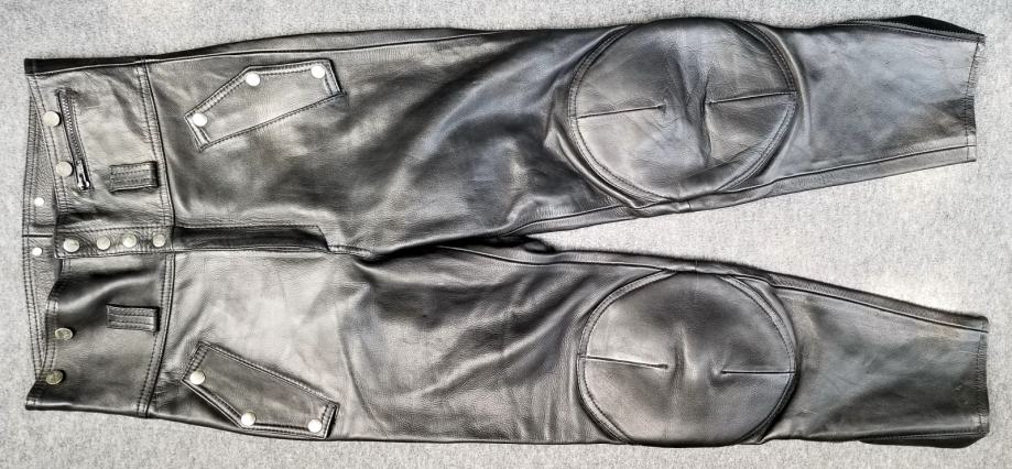 Teške, motorističke kožne hlače, napravljene od vrlo debele, teške kože, visokog struka. Štitnici u koljenima. Podstavljene punom duljinom. Cifovi za regulaciju nogavice. Itd.