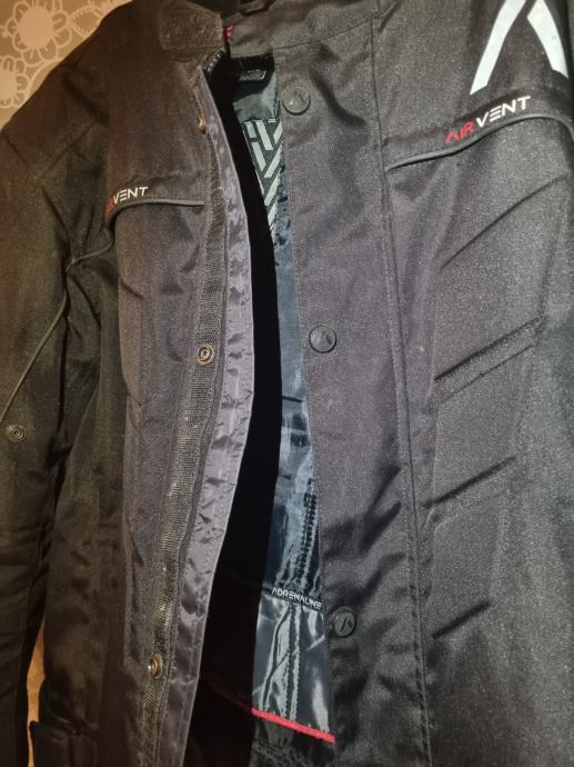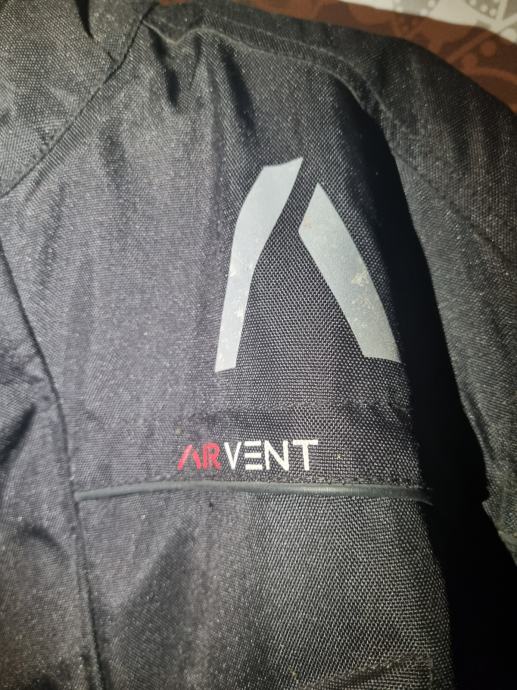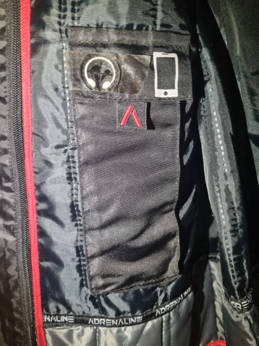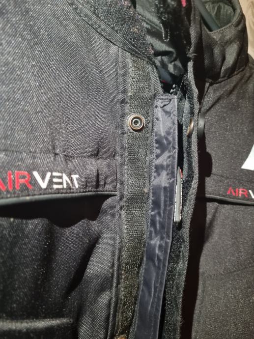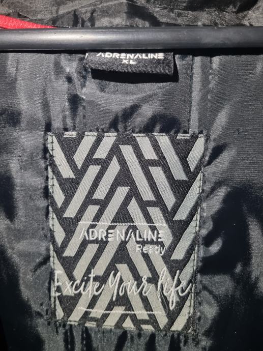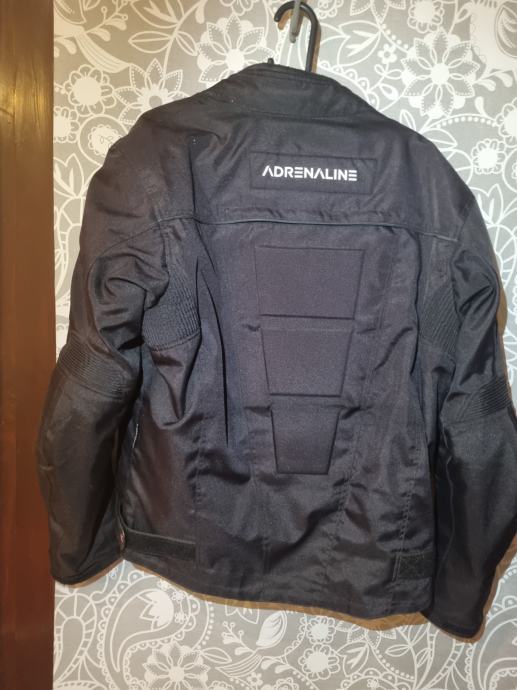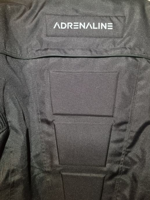 Muška motoristička jakna Adrenaline AirVent, veličina XL. Crna tekstilna jakna sportskog kroja, s oblikovanim mekanim ulošcima/pojačanjima na ramenima, laktovima i leđima te elastičnim naborima kod laktova za bolju pokretljivost. Centralni patentni zatvarač dodatno je zaštićen čičak preklopom i drukerima, a unutra se nalazi džep za mobitel s otvorom za slušalice te još nekoliko praktičnih džepova. Na ramenima i leđima su reflektirajući detalji i veliki Adrenaline / AirVent natpisi za bolju vidljivost u prometu. Jakna je jako malo nošena, bez vidljivih oštećenja ili izlizanih dijelova, prodajem je jer sam je prerastao i više mi ne odgovara veličinom.