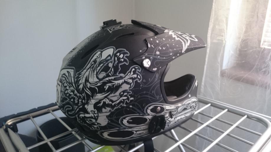 Kaciga je u savrsenom stanju, bez ogrebotina i pukotina jer nije padano s njom. Unutrasnjost kacige se lagano vadi radi pranja. Unutrasnjost je oprana nakon svakog koristenja. Na sebi ima Gopro mount sa desne strane i na vrhu.