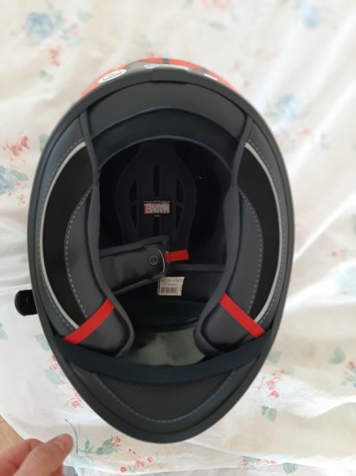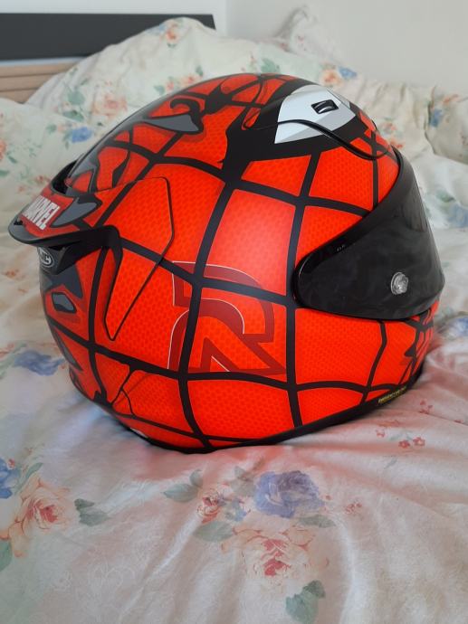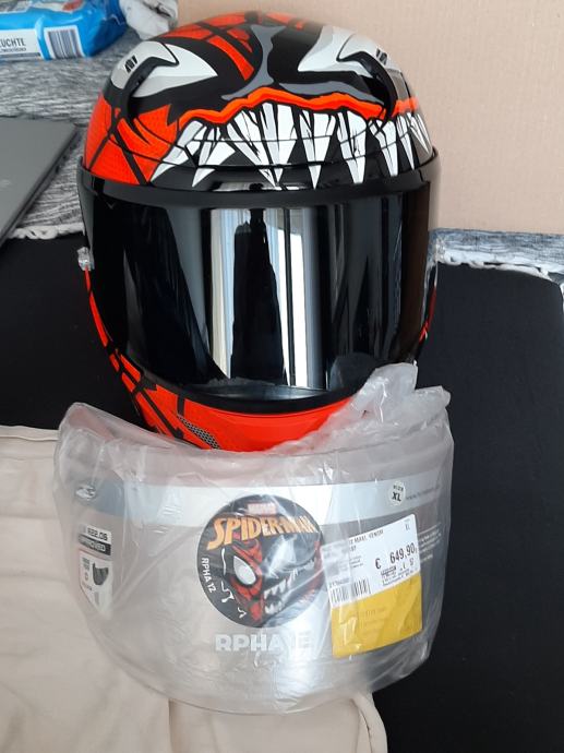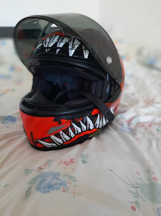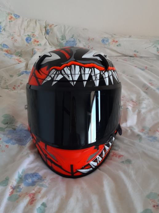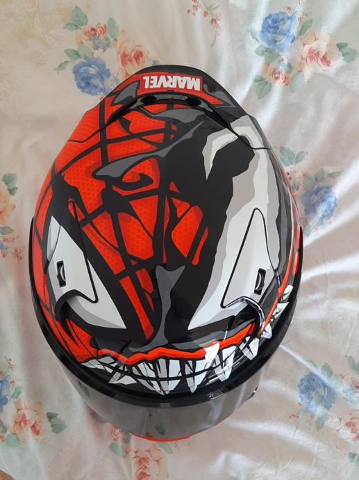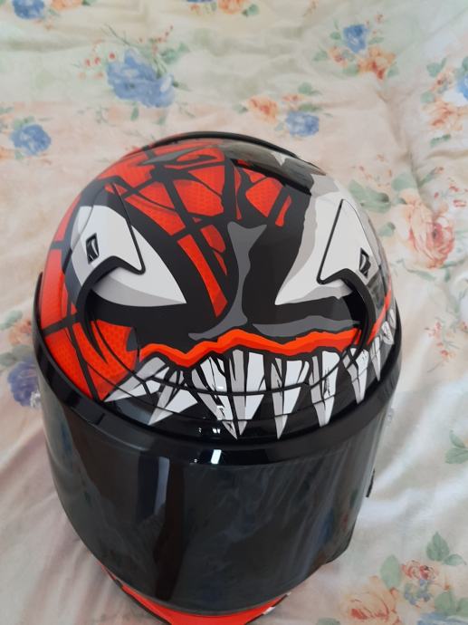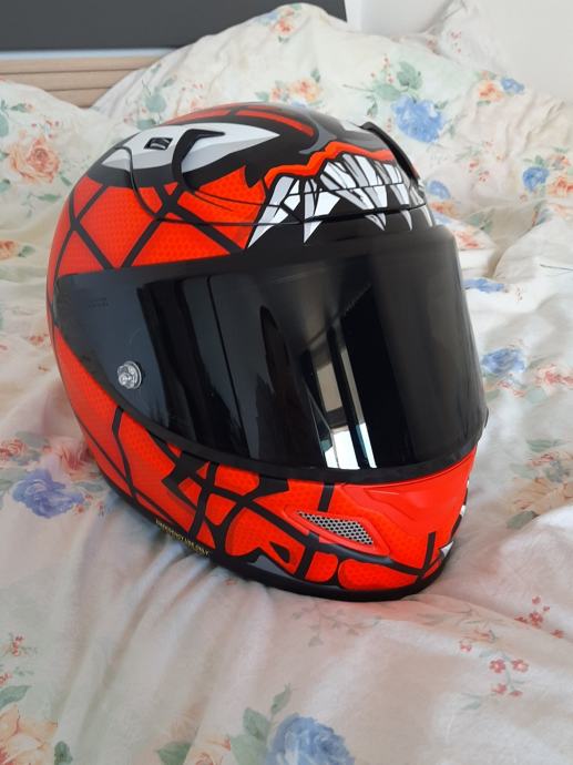 Kaciga je posebnog, atraktivnog dizajna – pola Spider-Man, pola Venom 2, što je čini pravim magnetom za poglede i savršenim izborom za ljubitelje Marvel tematike i sportskih motocikala.