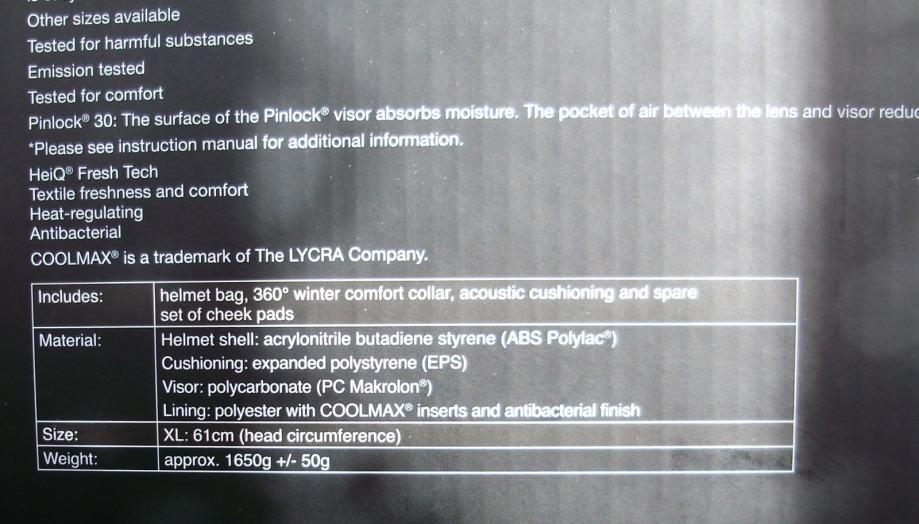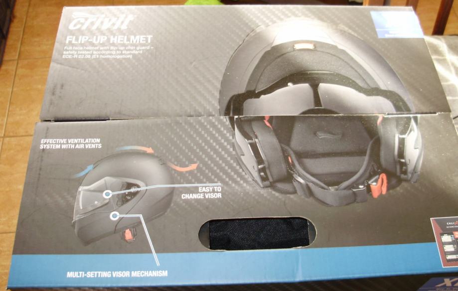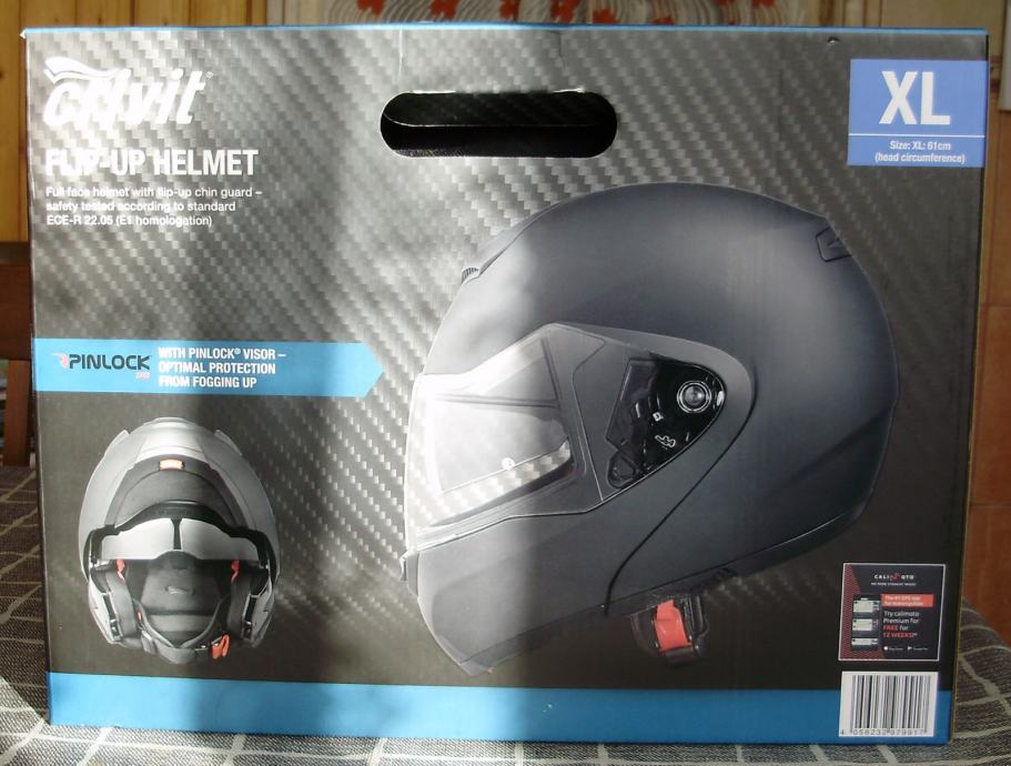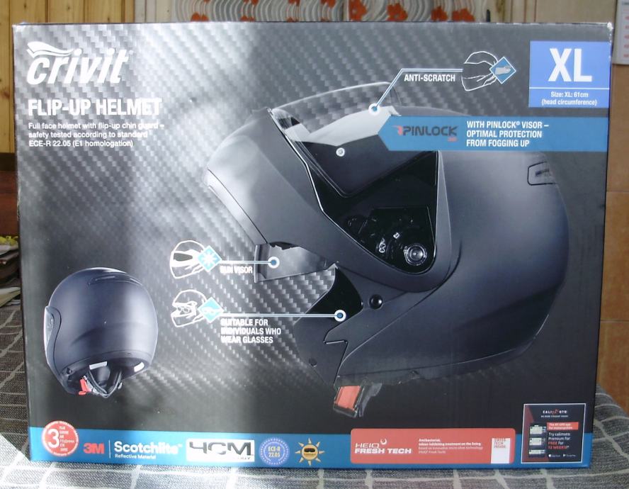 Nerabljena integralna kaciga, preklopna zaštita brade, podesive integrirane sunčane naočale, pogodna za nošenje dioptrijskih naočala. Veličina XL (61 cm).