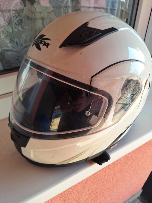 prodajem kappa kaciga za motor izbrisala se nalijepnica za velicinu ili je l ili xl za 30e,flip up kaciga,potrebno je suncane naocale zamijenit unutra jer su izgrecane na par mjesta.kaciga je kupljena prije 9 godina kostala 1000kn