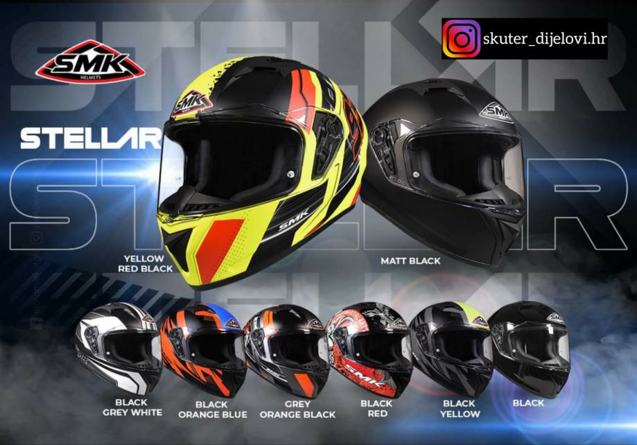 SMK Stellar je motociklistička kaciga koja pokriva cijelo lice, izrađena korištenjem materijala najnovije generacije i dvostrukim dizajnom za maksimalnu sigurnost i stil. Karakteriziraju ju odvažne konture i snažan agresivan dizajn. Mala težina i vrhunsko pristajanje vozačima pružaju veliku udobnost čak i tijekom duljeg korištenja.