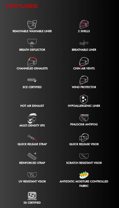 Izuzetno širok, brzo otpuštajući zamjenjivi vizir otporan na UV zračenje daje vozaču izvrstan pogled na cestu. Učinkoviti sustav ventilacije s naprednim kanaliziranim usisnicima zraka na štitniku za bradu i na vrhu kacige s ispusima zraka na stražnjoj strani, pruža maksimalnu udobnost čak i na dugim putovanjima i u svim vremenskim uvjetima.