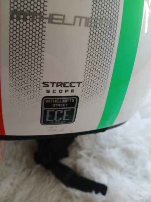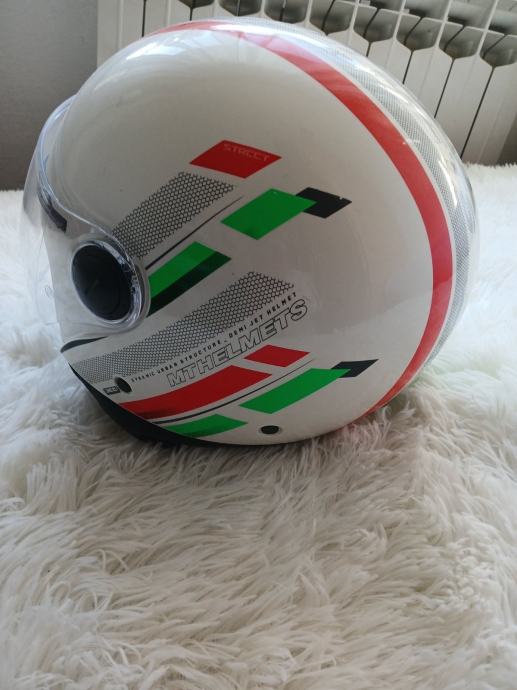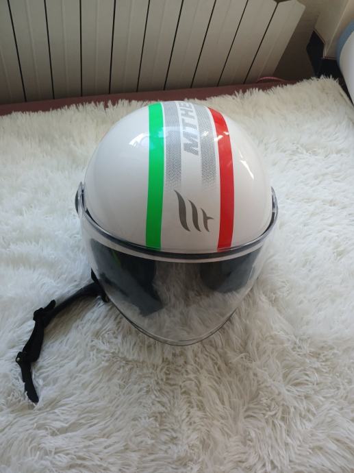 Zaštitna kaciga prikladna za skutere i motore. Europska homologacija. ABS materijal. Veličina S.Unutar se nalazi uklonjiva / periva i udobna podstava, remen za stezanje s brzim spajanjem. Kaciga ima kvalitetnu glatku završnu obradu i podesivi štit.