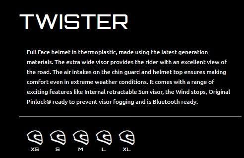 SMK Twister kaciga za cijelo lice dolazi s uzbudljivim nizom značajki kao što su unutarnji uvlačivi vizir za sunce, zaštita od vjetra i originalna priprema za pinlock vizira koji omogućuje sprječavanje magljenja. Kaciga također dolazi s integriranom pripremom za Bluetooth opciju kao dodatkom.