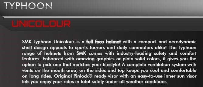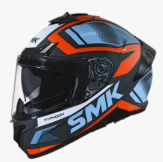 SMK Typhoon je motociklistička kaciga koja pokriva cijelo lice za sve ljubitelje motosporta s kompaktnim i aerodinamičnim dizajnom školjke. Poboljšan nevjerojatnom grafikom ili samo običnim bojama, nudi čisti užitak vožnje.