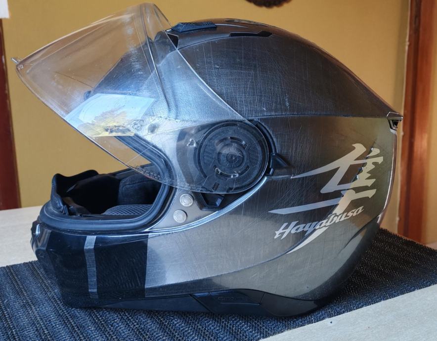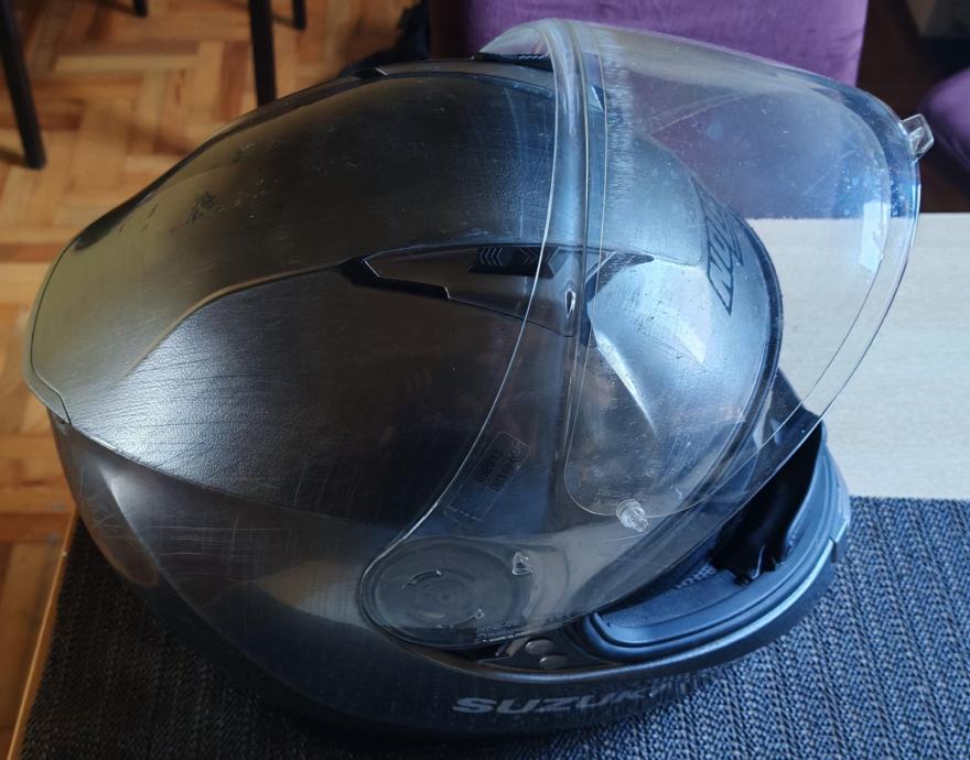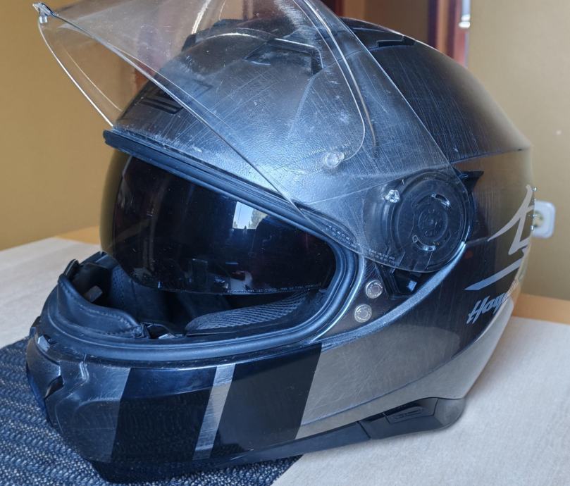 Korištena jednu sezonu, nema oštećenja i nije padala s motora. Unutrašnjost je periva te će biti očišćena i dezinficirana iako je nošena isključivo sa podkapom. Jedini nedostatak je što se unutarnji vizir za sunce teže spušta kad je skroz unutra ali mehanizam za spuštanje i podizanje funkcionira.