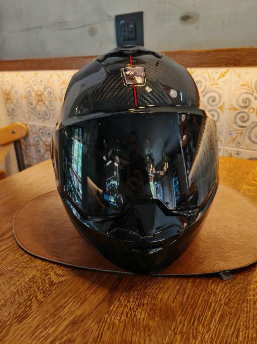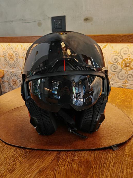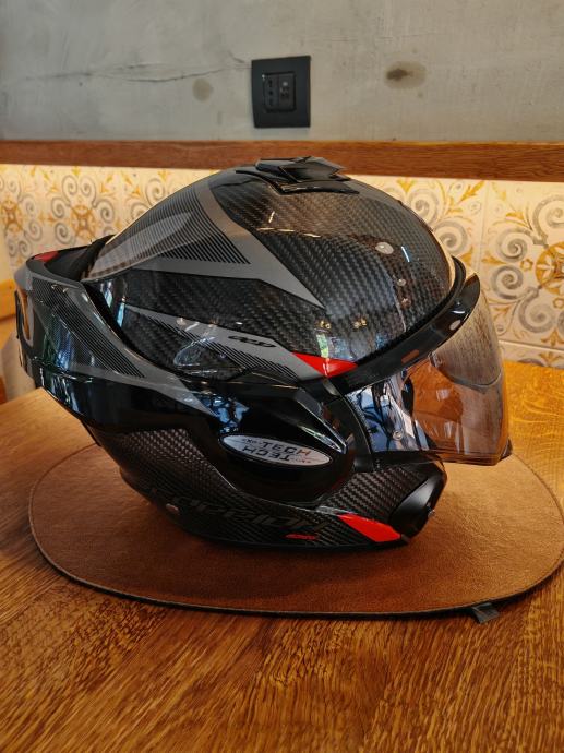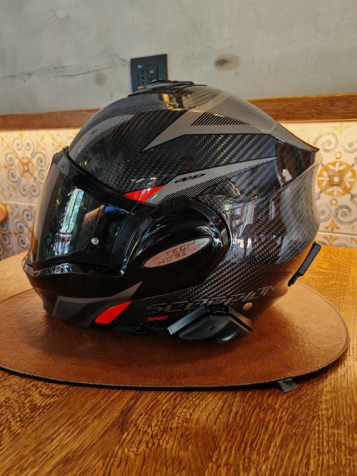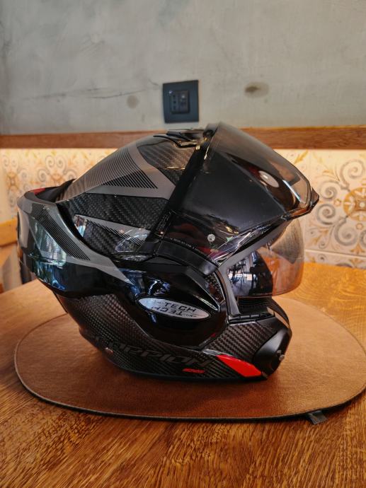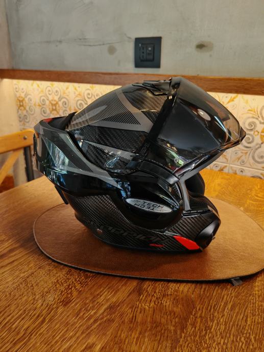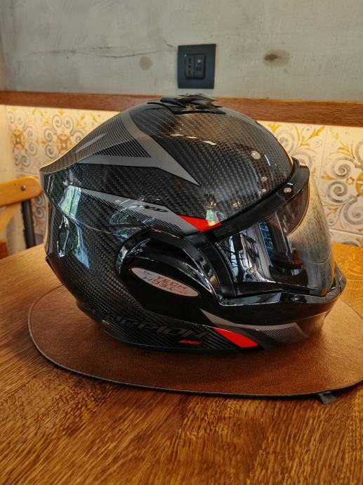 Scorpion Exo-Tech carbon s Scorpion komunikacijom. Kaciga je nošena doslovno dva puta i prodajemo zbog veličine jer je supruzi mala. Uz kacigu dodatno idu tamni vizir s pinlock I svjetli vizir isto s pinlockom, te original Scorpion komunikacija. Uglavnom, kaciga nova 450, komunikacija 150, extra vizir 40, extra 2*pinlock 60...sve skupa 700€. Prodajna cijena ovdje 390€