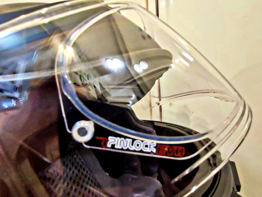 Nema jedne crtice. Kaciga ima ugrađen i pin-lock. Kaciga ima ugrađen i tamni vizir (naočale).