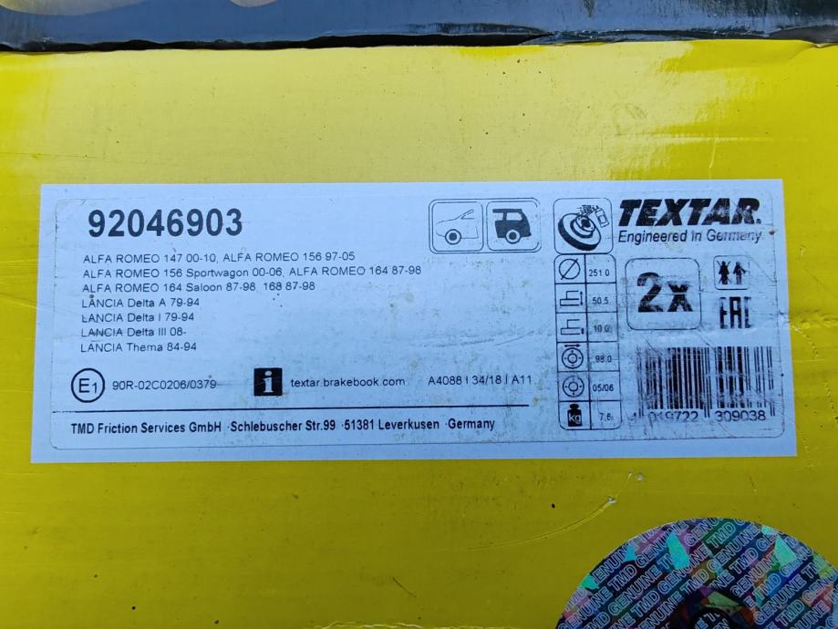 Kočioni disk zadnji TEXTAR ALFA ROMEO,FIAT,LANCIA 92046903 -par 45e