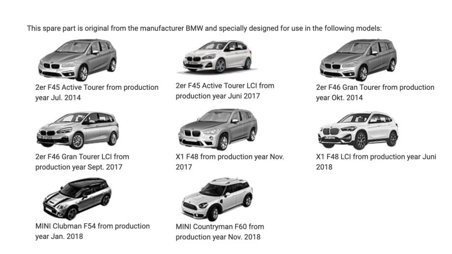 Odgovara i na druge BMW modele kao i neke Mini-e. Kao što je BMW X1 F48, BMW F45 Active Tourer