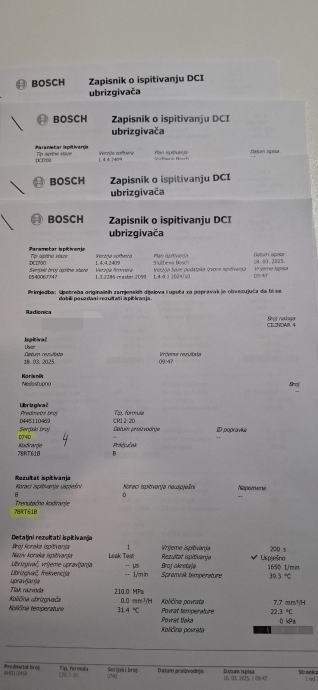 Potvrda za svaki injektor o ispitivanju.