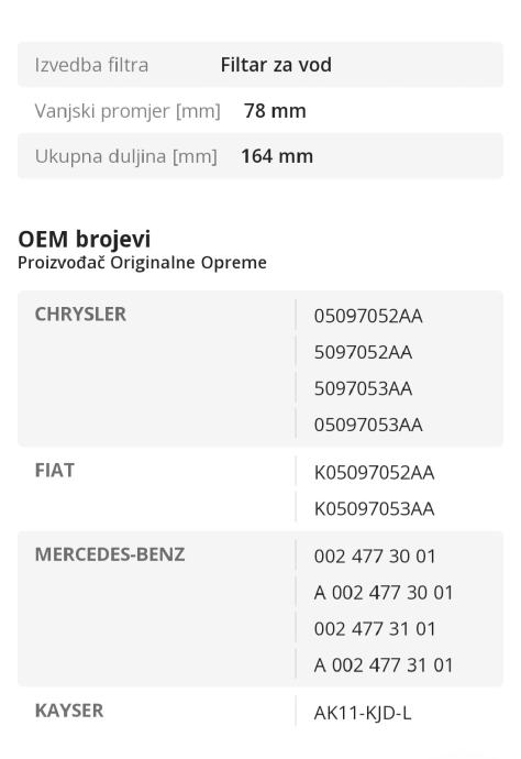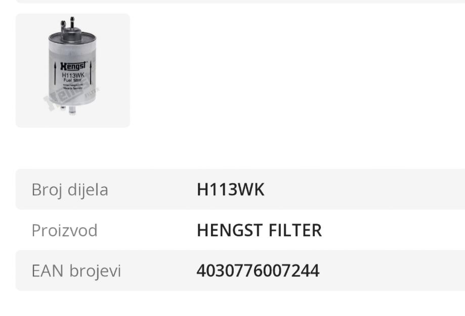 Prodajem filtar za gorivo HENGST FILTER H113WK. Originalno zapakiran. Kupljen greškom za Mercedes CLC 350 za koji se naknadno ispostavilo da nema filter za gorivo. Odgovara za mnoge modele Mercedesa koji su navedeni na priloženim slikama.