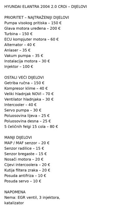 Hyundai Elantra 2004 2.0 CRDi – dijelovi – turbina, getriba, pumpa, hl