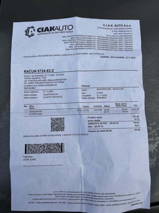 pozdrav prodajem klapnu gasa za seat ibizu 1.4 16v 2003g kupljenu 27.11.2025.Odgovara za VAG br:036 133 062 N.Krivo je kupljena trebao sam kupit za VAG br:036 133 062 L ( nije dao napraviti adaptaciju posto nije za moj motor) a kako je proslo vise od mjesec dana nemogu je vrataiti a u medjuvremenu sam kupio koja mi treba tako da ovu prodajem jeftinije a prakticki nova.