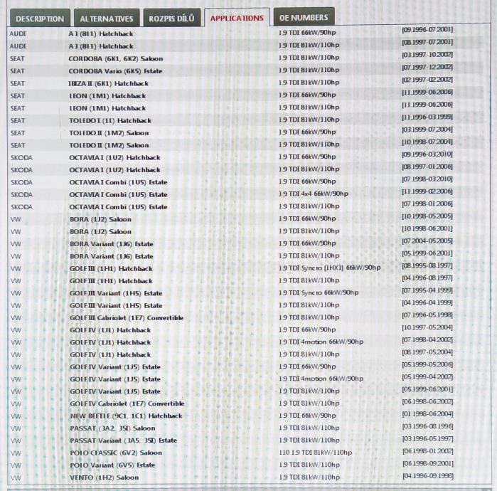Odgovara i za neke modele slijedećih tipova vozila: VW Beetle, Bora, Golf, Passat, Polo, Sharan, Vento; AUDI A3; SEAT Alhambra, Cordoba, Ibiza, Leon, Toledo