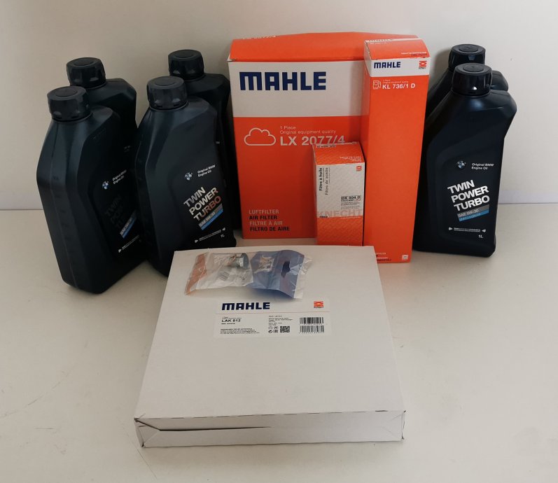 NOVI ORIGINALNI MAHLE ORIGINAL + BMW Set za mali servis za BMW (F30) vozila pogonjena s 320d dizelskim motorom snage 135KW proizvedena nakon 2011. godine. Originalni set za BMW vozila. Set se sastoji od MAHLE ORIGINAL filtera te 6L BMW TwinPower Turbo 5W30 ulja. MAHLE je dobavljač originalne opreme za BMW te su njihovi filteri tvornička ugradnja u BMW vozila. U setu se nalaze filter ulja, zraka, goriva te filter kabine (klime) s aktivnim ugljenom. OEM - BMW.