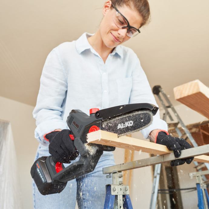 AL-KO akumulatorska mini lančana pila CSM 1815 savršeno vam pomaže pri piljenju i održavanju vrta. Rad neovisan o mreži i bez emisija. AL-KO lančana pila iz serije Comfort kompatibilna je s AL-KO 18 V BOSCH Home & Garden akumulatorskim sustavom, što je čini praktičnim izborom za jednostavne poslove rezanja. S duljinom vodilice od 15 cm i brzinom lanca od 7 m/s, omogućuje snažne performanse rezanja do 130 mm. Opremljena je SDL® (Smart Dynamic Lubrication) sustavom koji omogućuje praktično podmazivanje lanca prema potrebi. Veliki spremnik ulja od 30 ml s prozirnim prozorčićem olakšava nadzor razine ulja. Pila koristi okrugli zub niskog profila i zahtijeva alat za napinjanje lanca. Isporučuje se s praktičnim koferom za nošenje i 30 ml organskog ulja za lanac. Baterija i punjač nisu uključeni.