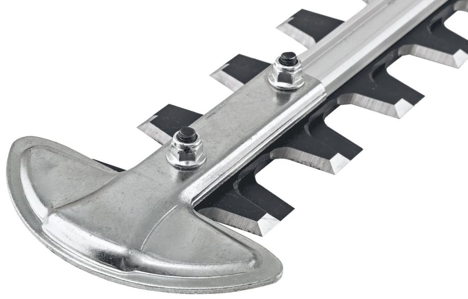 SOLO by AL-KO škare za živicu model 163-55 opremljene su kvalitetnom vodilicom noža s robusnim aluminijskim profilom. Na njoj sjedi laserom rezani i dijamantom brušeni sigurnosni nož od kaljenog specijalnog čelika s dužinom reza od 55 cm. Snažni protuhodni i vrlo izdržljivi nož vrlo učinkovito i precizno reže vašu živicu. Radi sprečavanja opasnosti od ozljeđivanja na oštrom, snažnom nožu uređaj ima pričvršćeni štitnik za zaštitu od porezotina.