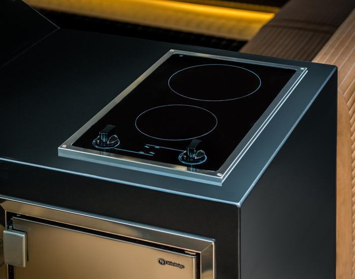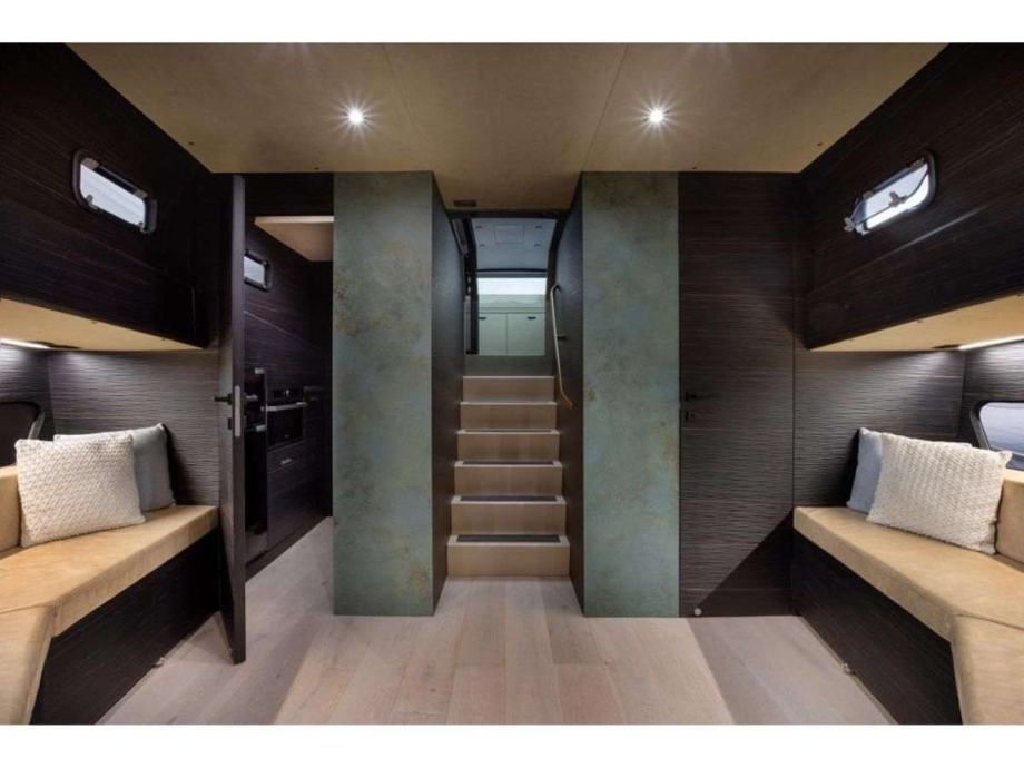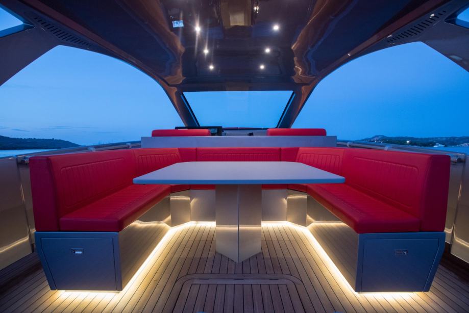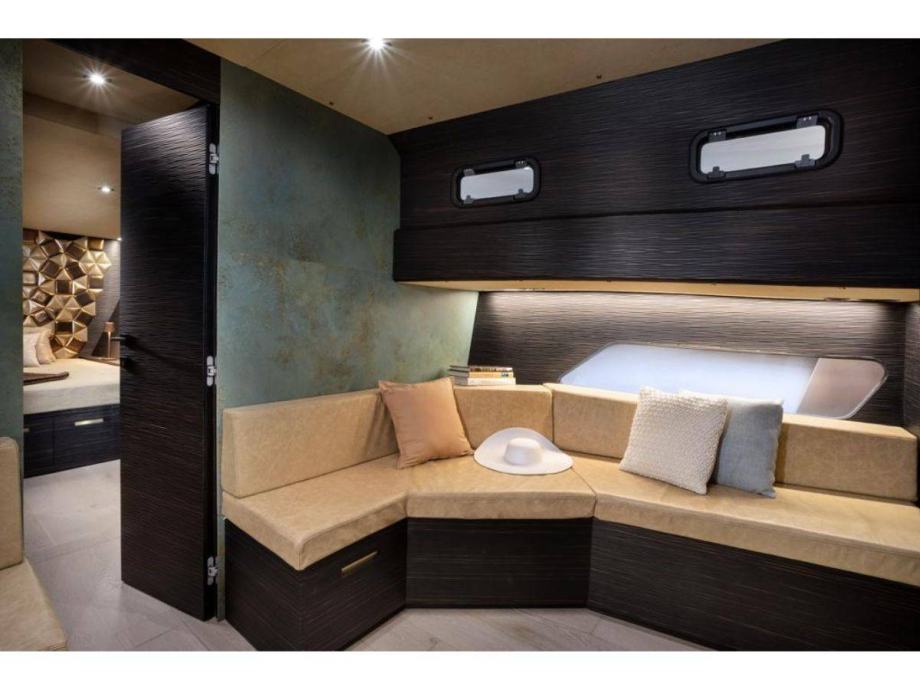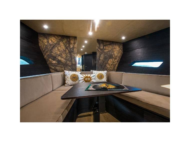 Krmeni dio omogućuje nesmetan pristup brodu i veliku ležaljku koja pokriva spremišta sa svim potrebnim prekidačima, utičnicama i docking stanicom.Fleksibilni prostor za blagovanje i dnevni boravak uključuje stol podesiv po visini i lijepo tapecirane sofe s ugrađenim spremištem. Višenamjenska kuhinja također se može natkriti kako bi se osiguralo dodatno sjedenje za goste ili odmor za kapetana tijekom upravljanja brodom.Udoban prolaz s integriranim karbonskim rukohvatima osigurava sigurno kretanje u svakom trenutku i lak pristup pramcu broda i njegovoj ogromnoj ležaljci za cjelodnevno izležavanje i uživanje u uzbudljivoj vožnji na valovima.