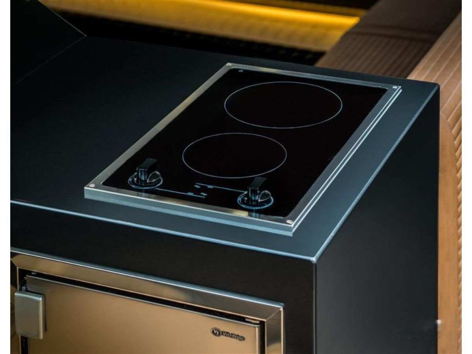 Potpuno opremljena kuhinja s hladnjakom, ledomatom, teppanyaki pločom za kuhanje, sudoperom i puno prostora za pohranu