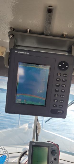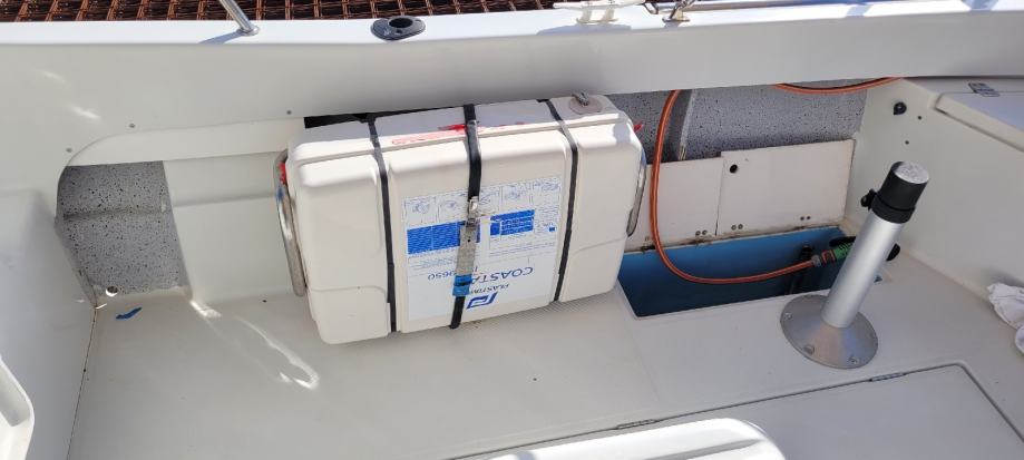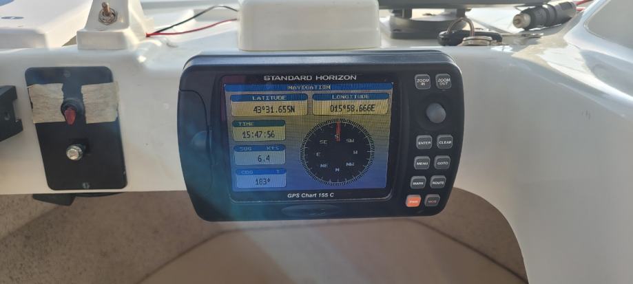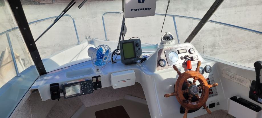 Od opreme ima Auto pilot, radar, sonder, gps, vhf stanicu, radio s dva zvucnika, reflektor s komandom na struju, 3 odvojene baterije (servisna 100 ah, glavni motor 70 ah, pomocni motor 60 ah), splav za spasavanje, prsluke, rucno sidro, elektricnu pumpu za pranje kuverte morskom vodom, elektricna pumpa za praznjenje santina s automatskim plovkom, alarm visokog nivoa, Trajno registriran