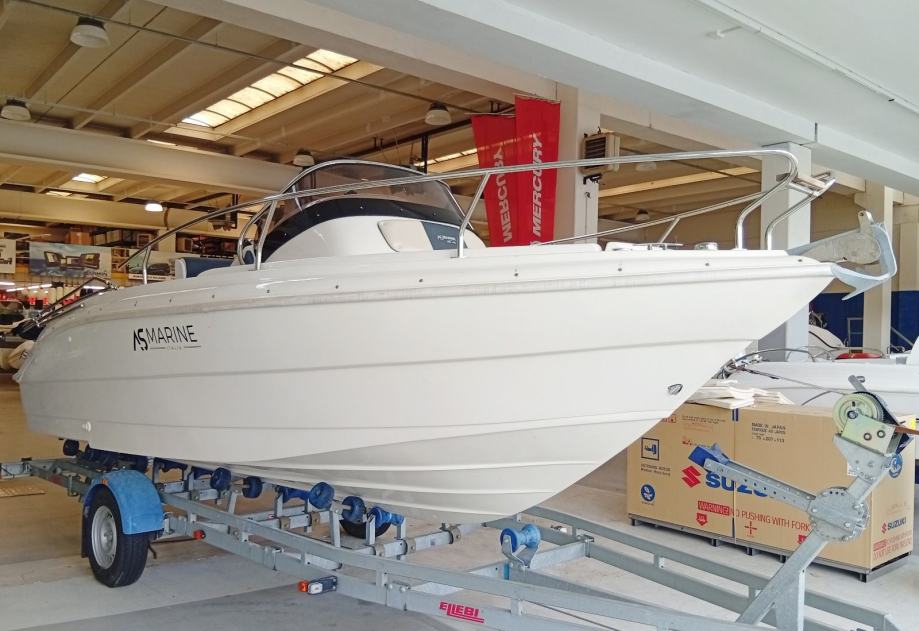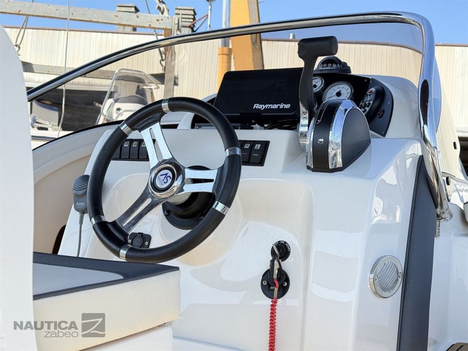 OSNOVNA OPREMA Konzola s inox nosačem, inox ručke na kormilu, vjetrobransko staklo, volan i upravljački mehanizam, sajla za upravljanje, bitve (4 komada), amortizer na stražnjoj klupi, navigacijska svjetla, konstrukcija od stakloplastike, bijeli trup, pretinci, jastuci za sjedenje, ljestve.