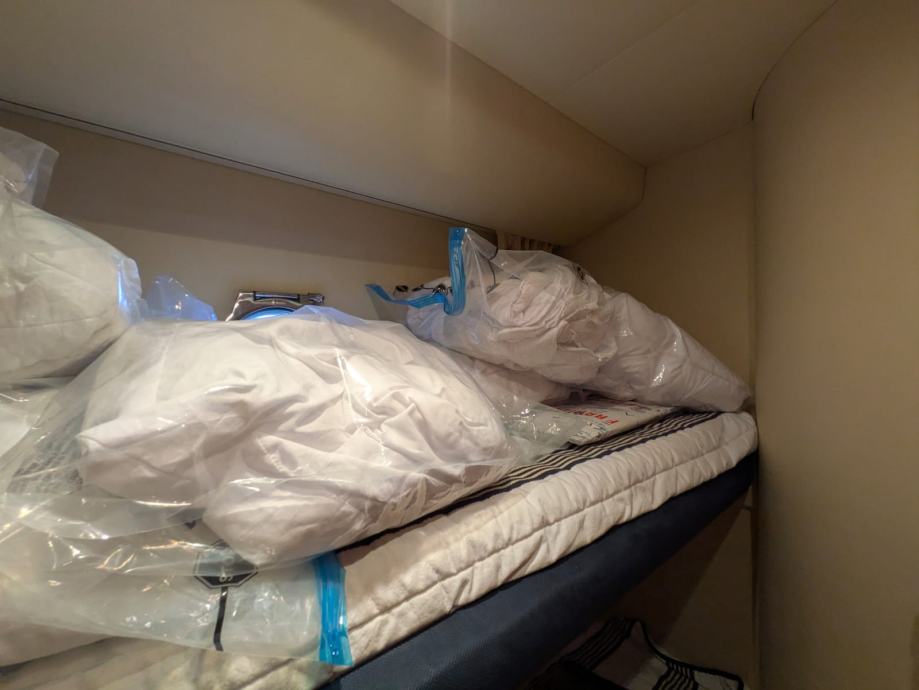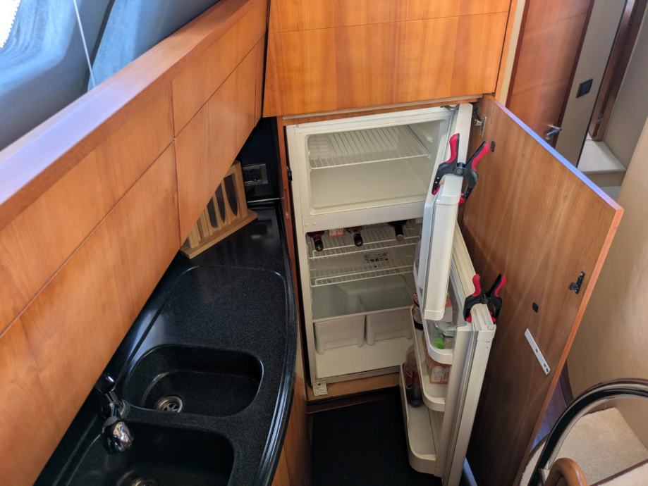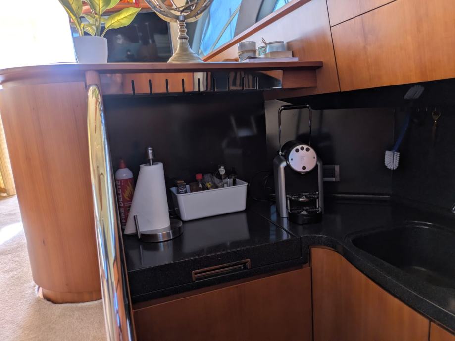 2. hladnjak, napa, staklokeramička ploča za kuhanje, sudoper, roštilj, električni WC, odvojena kabina za posadu, vlasnička kabina, gostinjska kabina, pramčana kabina, salon, kormilarsko mjesto unutra, kormilarsko mjesto na flybridgeu, sustav za gašenje požara, priključak za obalu 220V, glavni prekidač, automatsko pretraživanje satelitske antene, pokrov kokpita, jastuk za sunčanje, sustav vode pod tlakom, sustav tople vode, integrirana platforma za kupanje, krmena vrata prema platformi za kupanje, otvor na palubi, bar, stol u kokpitu, ljestve za kupanje, podvodna boja, električno sidreno vitlo na pramcu, reflektor, električna pasarela, trim pločice, električno/hidraulično, krmeni tuš toplo/hladno, satelitska TV