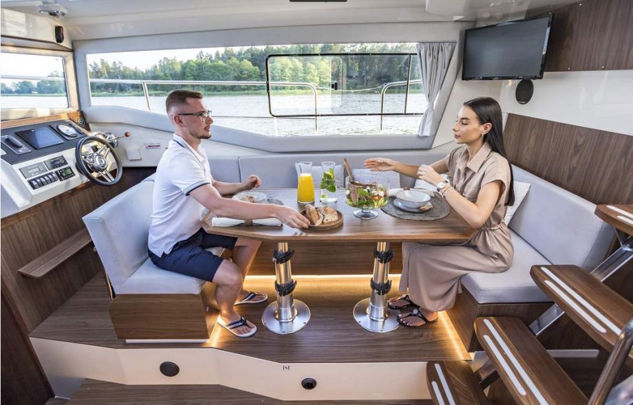 Središnji dio jahte na prvom katu nudi udobnu blagovaonicu s ekskluzivnom sofom i blagovaonom na razvlačenje za 4-6 osoba, stol i kuhinju sa svim aparatima poput hladnjaka, sudopera, štednjaka i pećnica. Sve je lijepo osvijetljeno zahvaljujući velikim prozorima i električno otvarajućim vratima. Promišljeno uređene sobe u Balt 37 Grand Hotelu pružaju obilje prostora za pohranu na diskretan i elegantan način. Ako više volite upravljati brodom unutra, dodatna kormilarnica dizajnirana je u neredu.