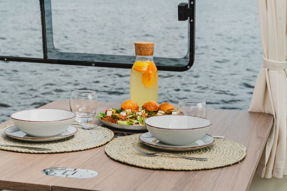 S lijeve strane salona je udobna blagovaonica sa stolom i udobnim sjedalima za četiri osobe. Blagovaonicu možete pretvoriti u dodatna dva mjesta za spavanje tako da srušite stol. Salon ima kuhinjski modul sa sudoperom, plinskim štednjakom, hladnjakom, ormarićem i praktičnim ladicama. Spremnici vode za nuždu i svi lako dostupni akumulatori nalaze se ispod poda salonskog prostora.