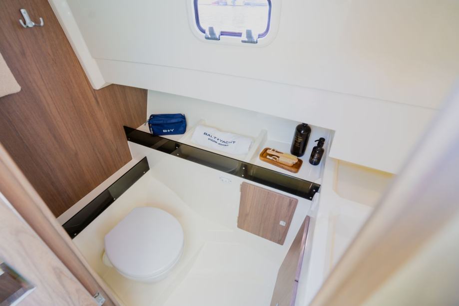 Prostor koji pruža maksimalnu udobnost, funkcionalna unutrašnjost plovila dizajnirana je da zadovolji i najviše zahtjeve. Prvo, ima prostranu pramčanu kabinu koja se može zaključati s duplim ležajem na pramcu, krevetom za pse i kupaonicom. I kabina i kupaonica su dovoljno osvijetljeni i prozračeni.