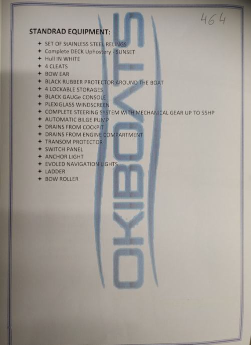 Na slici možete vidjeti službenu kompletnu standardnu opremu plovila Barracuda, proizvođača Okiboats.