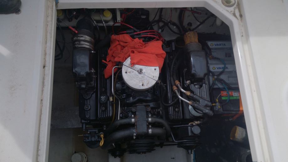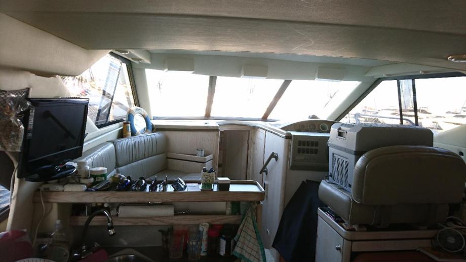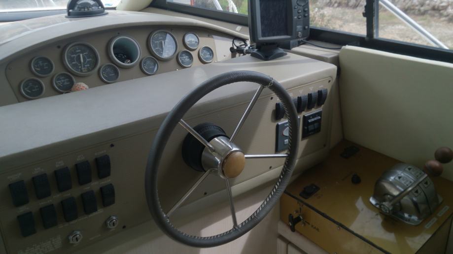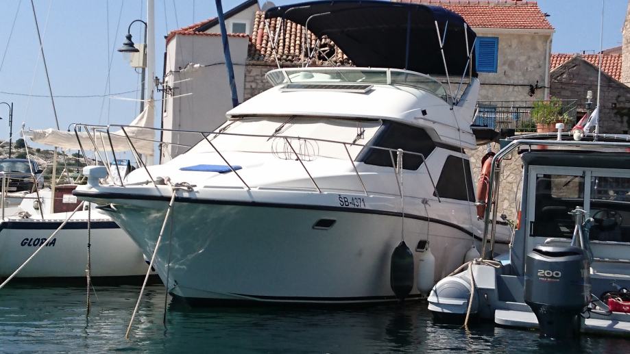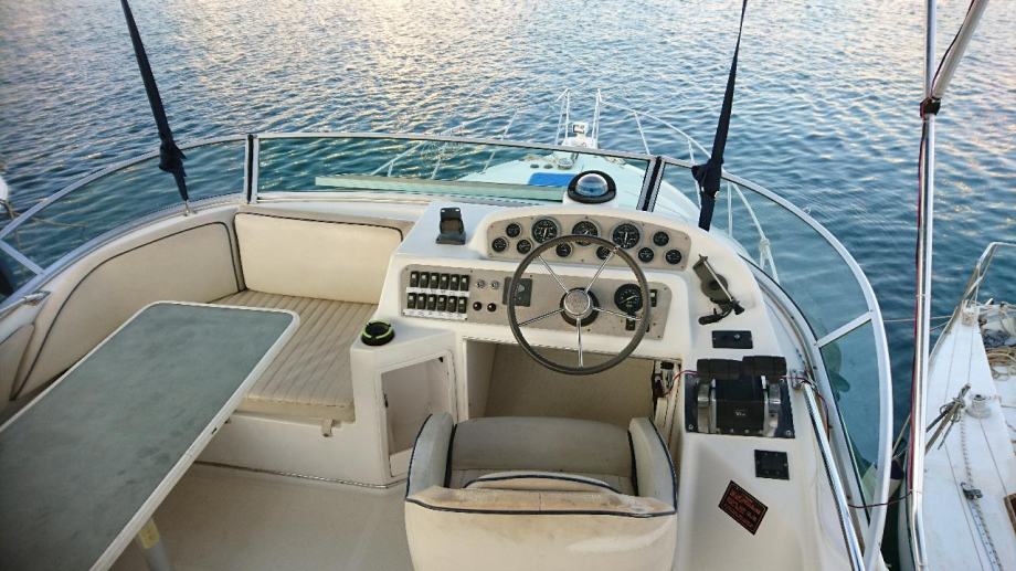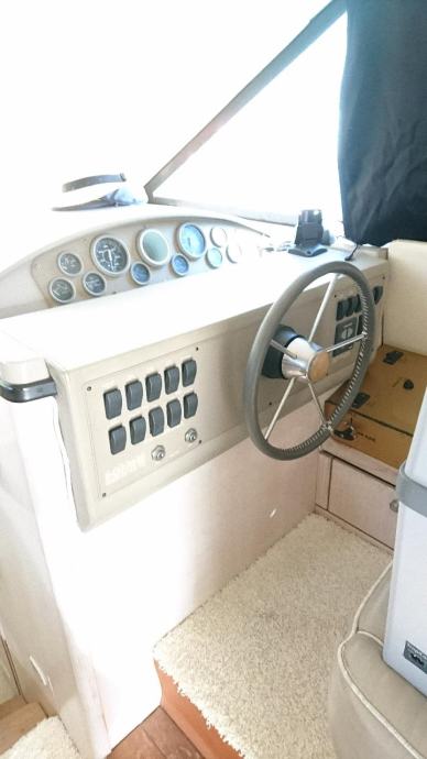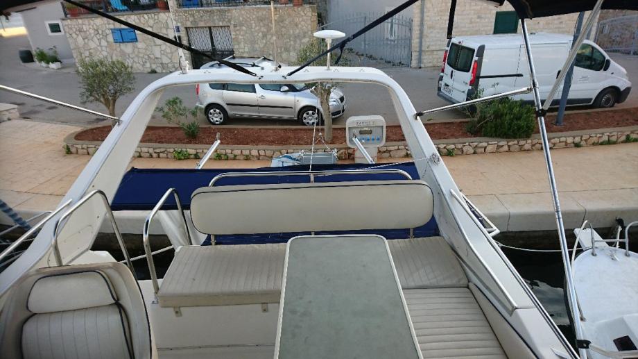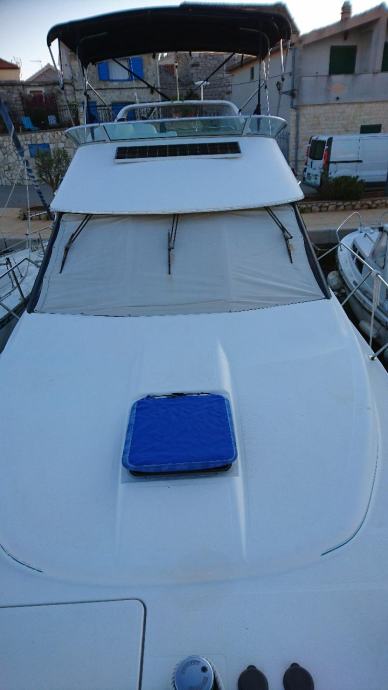 Brod potpuno opremljen za obiteljski godišnji odmor. Dvije kabine sa bračnim ležajevima, kupaonica sa wc-om i zatvorenom tuš kabinom, unutarnji kokpit, salon sa kuhinjom (frižider, sudoper, plinski štednjak...), fly bridge sa tendama. Krmena tenda, svi prozori imaju unutarnja sjenila i vanjske mreže/sjenila, topla voda, krmeni tuš i tuš u kupaonici, razvedene antenske tv i 12V instalacije, ventilatori (nema klime), prije nekoliko godina cijela unutrašnjost je pretapecirana, solarni punjač baterija, tri motorne baterije po 90 Ah + tri servisne baterije po 180 Ah, dva inox tanka za gorivo, tank vode 250 l, crni tank sa maceratorom 250 l, 2 x mercriuser 5.7 L od 184 kW, niti 50 radnih sati nakon remonta, sigurnosno gašenje požara u motornom prostoru, cijela krma je obučena u pluto (corkline), aluminijska pasarela, inox nosači pomočnog čamca (gruje), inox skale za u more, inox ograda na cjelom brodu, muzika alpine (sa daljinskim) sa zvučnicima u salonu i na fly bridgeu, led rasvijeta u tendi na fly bridgeu, fish finder, gps, pomočni čamac maestral. Sve je redovno održavano i u funkciji..brod je vlasnički i nikada nije bio u najmu. Brod se nalazi na šibenskom području. Zadnjih par godina brod stoji, te je potrebno napraviti servise motora, koper premaz, zamjenu cinkova i poliranje. Vez nije na prodaju! Cijena nije fiksna. Moguća zamjena za manji brod tipa Merry fisher.
